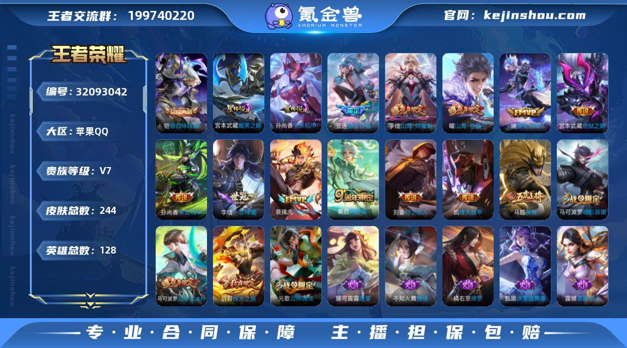 V7 1典藏 11传说 2星元 244皮肤 128英雄 【1水晶】铠-银白咏叹调【11传说】曜-山海·苍雷引,李信-山海·炽霜斩,宫本武藏-地狱之眼,铠-绛天战甲,李信-一念神魔,刘备-时之恋人,孙尚香-末日机甲,亚连-落雪白狼,澜-逐花归海,桑启-鸣野蒿,裴擒虎-祥瑞亨通【2星元】孙尚香-未来机甲,宫本武藏-幽冥之眼【53史诗】元歌-无心,上官婉儿-神器·万象笔,鬼谷子-五谷丰年,赵云-未来纪元,钟无艳-超时空战士,澜-赏金猎手,夏洛特-永昼,安琪拉-心灵骇客,白起-星夜王子,百里守约-特工魅影,百里玄策-原初追逐者,不知火舞-魅语,蔡文姬-舞动绿茵,蔡文姬-繁星吟游,嫦娥-拒霜思,妲己-女仆咖啡,妲己-魅力维加斯,狄仁杰-魔术师,狄仁杰-鹰眼统帅,貂蝉-圣诞恋歌,伽罗-箭羽风息,宫本武藏-鬼剑武藏,后羿-辉光之辰,花木兰-水晶猎龙者,橘右京-修罗,兰陵王-暗隐猎兽者,李白-千年之狐,李元芳-逐浪之夏,刘邦-德古拉伯爵,露娜-紫霞仙子,吕布-圣诞狂欢,马超-神威,马可波罗-暗影游猎,墨子-金属风暴,娜可露露-晚萤,上官婉儿-梁祝,孙尚香-水果甜心,小乔-青蛇,雅典娜-冰冠公主,嬴政-暗夜贵公子,虞姬-霸王别姬,元歌-云间偶戏,云中君-纤云弄巧,张飞-乱世虎臣,赵云-皇家上将,甄姬-冰雪圆舞曲,甄姬-游园惊梦,庄周-玄嵩,扁鹊-奇幻香踪,暃-星界游侠,刘禅-电玩·爆裂旋风,马可波罗-山海·玄木吟,蒙犽-百解令