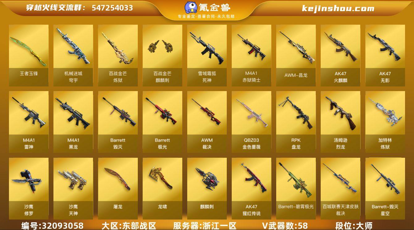 【ky6197】浙江一区-64V-1王者武器数-0炫金武器数 【热门武器】:QBZ03-金色蔷薇,死亡之眼,汤姆逊-烈龙*5,RPK-盘龙*4,加特林-炼狱,沙鹰-修罗 【王者炫金武器】:王者玉锋 【音效卡】:Barrett-毁灭音效卡,Barrett-碧霄极光音效卡,炼狱-百战金芒-庆典舞曲音效卡,死神-雪域霜狐-怀旧音效卡 【皮肤】:金色蔷薇-电竞之星 皮肤,AWM-裁决-百城联赛天津皮肤,M4A1-再燃火线,雷神-神秘按键 皮肤,毁灭-荣耀之怒,毁灭-星空,毁灭-英雄计划 皮肤,屠龙-春桃 皮肤,轻型军用手斧-再燃火线 【角色】:零·纪元,战地猎狐,堕落女神,雪域霜狐,葵-阿尔法武装,幻面灵狐,初恋灵狐,风暴女,兰-空鹰,零-水下丽影,玫瑰花神,潘多拉-甜心教官,蛇姬,斯沃特-X,兔囡囡,雪莉杨-摸金校尉,影武者-X 【人偶武器】:白虎-迷你小艾,AWM-灵狐-15周年嘉年华,迷你牛牛,迷你生化手雷,生化手雷-机甲核心,深渊终结者手雷 【暴走生化】:死亡之眼,超级对讲机 【挑战大师】:激光毁灭者III-白马银枪 【英雄级武器】:AK47-火麒麟,M4A1-黑龙*3,M4A1-雷神*2,AK47-无影,死神-雪域霜狐,QBZ03-金色蔷薇,AK-47-猩红传说,HK417-朱雀-电竞之星,机械迷城-穹宇,Barrett-毁灭*4,Barrett...