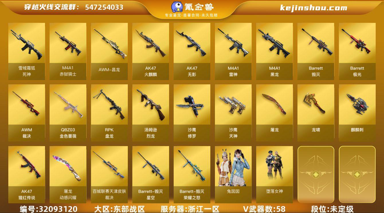浙江一区-64V-1王者武器数-0炫金武器数 【热门武器】:QBZ03-金色蔷薇,死亡之眼,汤姆逊-烈龙*5,RPK-盘龙*4,加特林-炼狱,沙鹰-修罗 【王者炫金武器】:王者玉锋 【音效卡】:Barrett-毁灭音效卡,Barrett-碧霄极光音效卡,炼狱-百战金芒-庆典舞曲音效卡,死神-雪域霜狐-怀旧音效卡 【皮肤】:金色蔷薇-电竞之星 皮肤,AWM-裁决-百城联赛天津皮肤,M4A1-再燃火线,雷神-神秘按键 皮肤,毁灭-荣耀之怒,毁灭-星空,毁灭-英雄计划 皮肤,屠龙-春桃 皮肤,轻型军用手斧-再燃火线 【角色】:零·纪元,战地猎狐,堕落女神,雪域霜狐,葵-阿尔法武装,幻面灵狐,初恋灵狐,风暴女,兰-空鹰,零-水下丽影,玫瑰花神,潘多拉-甜心教官,蛇姬,斯沃特-X,兔囡囡,雪莉杨-摸金校尉,影武者-X 【人偶武器】:白虎-迷你小艾,AWM-灵狐-15周年嘉年华,迷你牛牛,迷你生化手雷,生化手雷-机甲核心,深渊终结者手雷 【暴走生化】:死亡之眼,超级对讲机 【挑战大师】:激光毁灭者III-白马银枪 【英雄级武器】:AK47-火麒麟,M4A1-黑龙*3,M4A1-雷神*2,AK47-无影,死神-雪域霜狐,QBZ03-金色蔷薇,AK-47-猩红传说,HK417-朱雀-电竞之星,机械迷城-穹宇,Barrett-毁灭*4,Barrett-极光*2,AWM-裁决,Barrett-金色蔷薇,RPK-盘龙*4,加特林-炼狱,炼狱-百战金芒,汤姆逊-烈龙*5,沙鹰-修罗,沙鹰-天神,屠龙*2,龙啸*2,麒麟刺,麒麟刺-百战金芒,高爆手雷-雷霆*2,闪光弹-雷霆*2,烟雾弹-雷霆*2,M4A1-赤狱骑士,AWM-昌龙,Barrett-碧霄极光*3 【道具】:BS战队炫彩背包,CFS限定背包,云山科技背包,亚洲杯纪念炫彩背包,炫彩背包-诺拉,炫彩背包,百战金芒炫彩背包,背包-洛丽塔,虎牙炫彩背包,雪域霜狐炫彩背包,女皇终结者-魔龙之吻,救世主-黑桃战神,黄金生化钩,绿色巨人,灵魂忍者,变异宝贝,迷雾幽灵,夺命之镰,防...