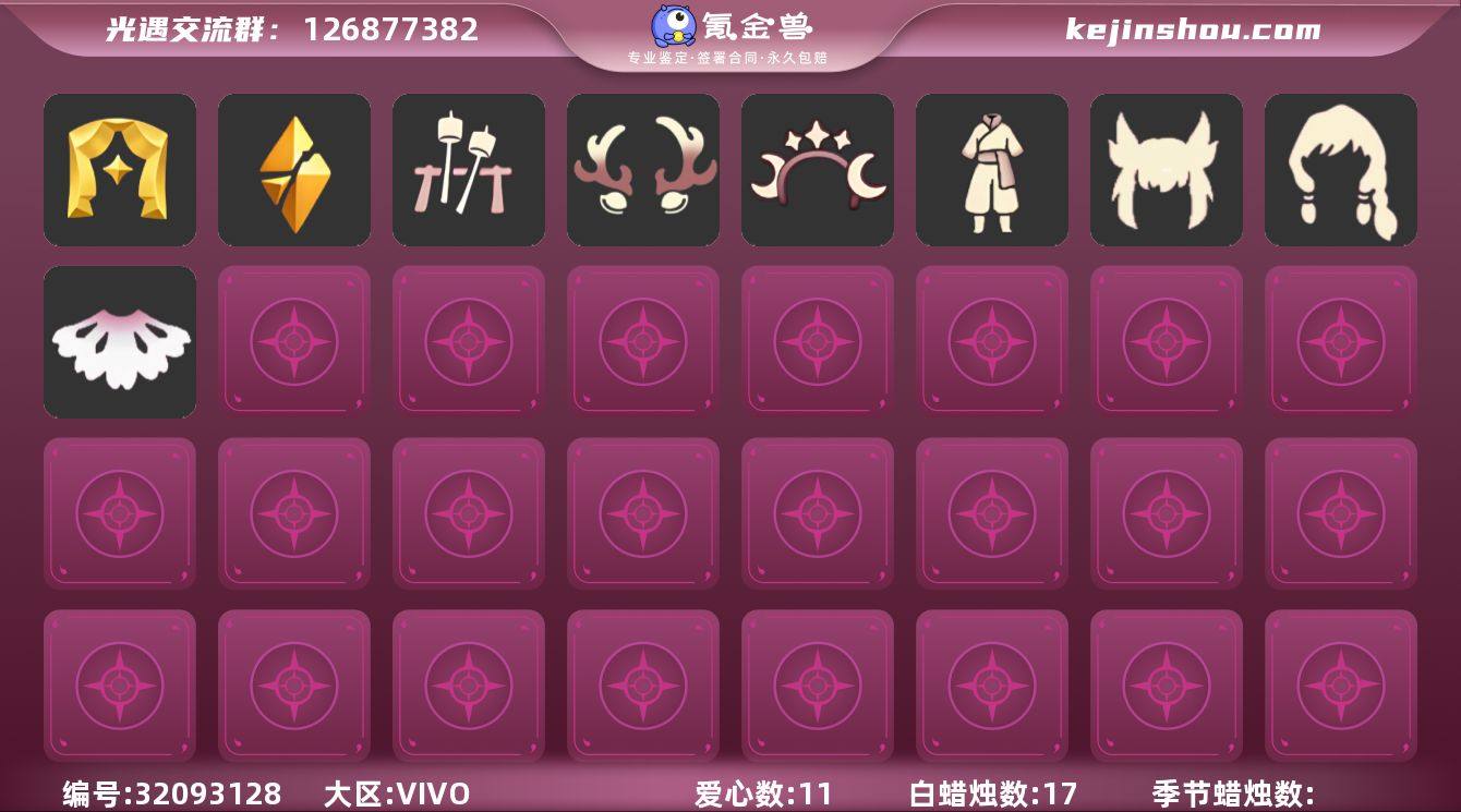 vivo渠道三季奶14白枭巫师蝙蝠暗彩裤 季节:表演季,破晓季,欧若拉季半 礼包:祥云服饰,暗彩装扮,蝙蝠套装,巫师帽,贝壳头饰,小兔子,小黄鸭发饰,星月头饰,日光耳坠,彩虹耳饰,鹿角,tgc斗篷,祥云纸伞,篝火点心,欧若拉之声,音韵吉他 热门物品:红围巾,公主头,书虫,箬笠,白枭,猫猫头,樱花斗,椅子等 资源:17/11/15 身高2.3-14.3当前2.4 -具体资源以衣柜为准-