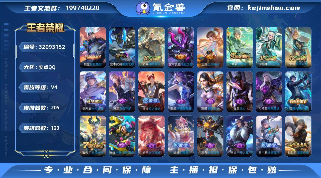 V4 1典藏 4传说 1星元 205皮肤 123英雄 【1水晶】韩信-弑枪猎影【4传说】宫本武藏-地狱之眼,桑启-鸣野蒿,云缨-幻光神枪,后羿-神树通天【1星元】宫本武藏-幽冥之眼【40史诗】元歌-无心,鬼谷子-五谷丰年,赵云-未来纪元,白起-星夜王子,百里守约-特工魅影,百里玄策-原初追逐者,蔡文姬-舞动绿茵,嫦娥-拒霜思,妲己-女仆咖啡,狄仁杰-鹰眼统帅,宫本武藏-鬼剑武藏,铠-曙光守护者,李白-千年之狐,刘邦-德古拉伯爵,刘禅-绅士熊喵,露娜-紫霞仙子,吕布-末日机甲,墨子-金属风暴,司马懿-暗渊魔法,孙策-猫狗日记,孙尚香-水果甜心,孙尚香-蔷薇恋人,夏侯惇-乘风破浪,项羽-苍穹之光,小乔-缤纷独角兽,雅典娜-冰冠公主,杨玉环-遇见飞天,云中君-纤云弄巧,张飞-乱世虎臣,甄姬-冰雪圆舞曲,诸葛亮-黄金分割率,梦奇-顽趣,刘禅-电玩·爆裂旋风,蒙犽-百解令,蒙恬-荣光圣徽,狂铁-龙之律动,黄忠-百相守梦,少司缘-巫礼祀神,女娲-万灵启世,莱西奥-光弋星穹