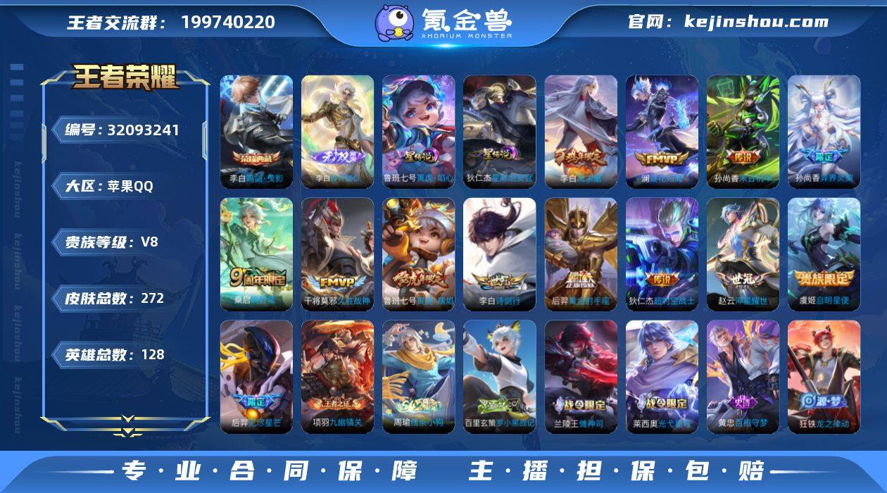 苹果Q-V8-最强王者段位-有限制-2星元-128英雄-272皮肤-1典藏皮肤-1无双-13传说-72史诗 【英雄全皮】:李白全皮,猪八戒全皮,空空儿全皮 【荣耀典藏】:李白鸣剑曳影 【无双皮肤】:李白碎月剑心 【传说皮肤】:桑启鸣野蒿,澜逐花归海,李白诗剑行,后羿无尽星芒,鲁班七号寅虎瑞焰,孙尚香异界灵契,赵云淬星耀世,虞姬启明星使,干将莫邪久胜战神,后羿黄金射手座,李白凤求凰,孙尚香末日机甲,狄仁杰超时空战士 【限定皮肤】:白起狰,大乔绒语心约,李白谪仙醉月,狄仁杰阴阳师,虞姬凯尔特女王,赵云皇家上将,墨子神迹守卫,孙尚香异界灵契,鲁班七号寅虎瑞焰,庄周高山流水,高渐离玩趣恶龙,孙膑妖精王,扁鹊炼金王,芈月重明,芈月幻夜卜梦,元歌云间偶戏,夏侯惇朔风刀,甄姬女儿国国王,曹操烛龙,典韦穷奇,典韦岱宗,狄仁杰魔术师,狄仁杰万华元夜,达摩沙漠行僧,项羽海滩派对,老夫子醍醐杖,老夫子航海奇遇记,程咬金演武夺筹,韩信逐梦之影,韩信飞衡,兰陵王金庭之子,花木兰默契交锋,亚瑟潮玩骑士王,孙悟空孙行者,牛魔御旌,后羿如梦令,后羿圣弓游侠,后羿无尽星芒,李元芳银河之约,李元芳云中旅人,虞姬启明星使,钟馗驱傩正仪,杨玉环遇见飞天,干将莫邪真爱魔法,太乙真人饕餮,黄忠火炮绅士,苏烈千军破阵,百里玄策原初追逐者,弈星混沌棋,公孙离蜜橘之夏,沈梦溪星空之诺,明世隐疑决卦,裴擒虎李小龙,裴擒虎擒涛扼浪,狂铁御狮,米莱狄御霄,伽罗天狼溯光者,盾山御銮,猪八戒西部大镖客,猪八戒猪悟能,嫦娥拒霜思,鲁班大师探海日志,桑启海盐诗旅,张良古海寻踪,李白碎月剑心,安琪拉乘龙聚宝船,沈梦溪龙舞盛年,周瑜熔金海岸 【年限皮肤】:李白凤求凰,典韦岱宗,韩信飞衡,鲁班七号寅虎瑞焰,安琪拉乘龙聚宝船 【赛季限定】:孙膑妖精王,扁鹊炼金王,虞姬凯尔特女王...