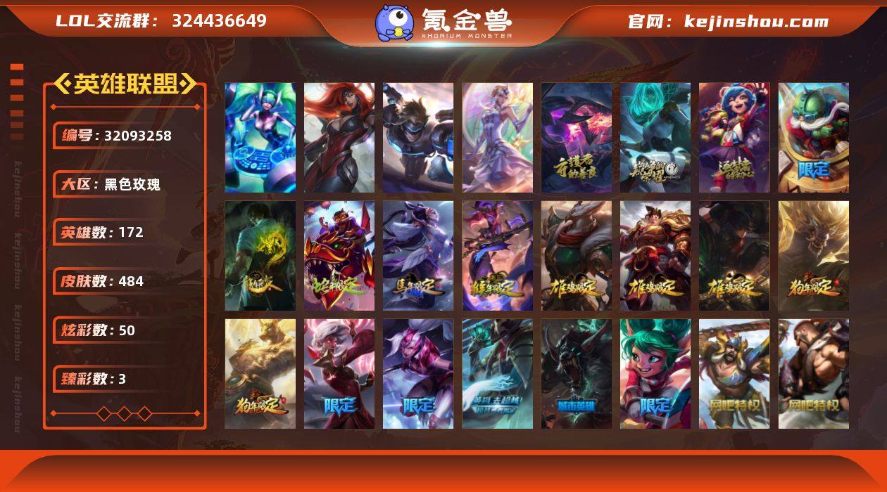 未定级段位-172英雄-484皮肤-50炫彩-4终极-3神话-117限定-59传说-117史诗 【神话皮肤】:十周年纪念安妮,源代码乐芙兰,暗星科加斯 【珍稀头像】:至爱的鹿头像 【热门头像】:KDA阿卡丽头像 【臻彩皮肤】:龙的传人李青飞龙在天,吕布奉先炫金战神,冠军典狱长锤石凯旋圣装 【年限皮肤】:龙的传人李青,神龙之翼库奇,广寒仙子嫦娥,玉净夜叉凯特琳,张辽文远,司马懿仲达,虎痴之拳蔚,南天之怒沃里克,北辰之威内瑟斯 【情人节限定】:甜心宝贝安妮,觅心猎手薇恩,觅心游侠卢锡安,觅心女王艾希 【冰雪限定】:幸福女神乐芙兰,圣诞开心鬼提莫,圣诞精灵崔丝塔娜,圣诞狂欢努努和威朗普,圣诞糖果棒厄运小姐,阿木木“主人不要我了”,胡桃夹子萨科,平安夜女神娑娜,英勇玩具兵普朗克,邪恶圣诞老人维迦,喜庆之树茂凯,冬季仙境奥莉安娜,雪默丁格,圣诞玩偶波比,圣诞老人古拉加斯,圣诞驯鹿克格莫,魄罗骑士瑟庄妮,雪球也能爆炸吉格斯,圣诞老人德莱文,圣诞捣蛋鬼金克丝,冰雪节玛尔扎哈,冰雪节格雷福斯,冰雪女神辛德拉 【终极皮肤】:大元素使拉克丝,DJ娑娜,未来战士伊泽瑞尔,武装战姬厄运小姐 【限定皮肤】:哥特萝莉安妮,战熊骑士瑟庄妮,奥斯曼大帝普朗克,生化领主泰达米尔,卧虎藏龙贾克斯,舞会公主安妮,诺斯费拉图弗拉基米尔,养蜂人辛吉德,地底世界崔斯特,斩星魔剑易,冠军典狱长锤石,冠军之矛卡莉丝塔,冠军之刃锐雯2016,冠军之隐劫,冠军之箭艾希,冠军掠夺者卡兹克,Fnatic古拉加斯,Fnatic嘉文四世,Fnatic卡尔萨斯,Fnatic库奇,暗杀星蒙多,暗杀星努努和威朗普,暗杀星慎,暗杀星伊泽瑞尔,SKTT1贾克斯,SKTT1薇恩,SSW图奇,SSW泰隆,SSW锤石,SKTT1卡莉丝塔,SKTT1雷克顿,SKTT1瑞兹,SKTT1伊莉丝,SKTT1奥拉夫,SSG霞,安妮梦游仙境,勇敢的心德莱厄斯,电玩女神厄运小姐...