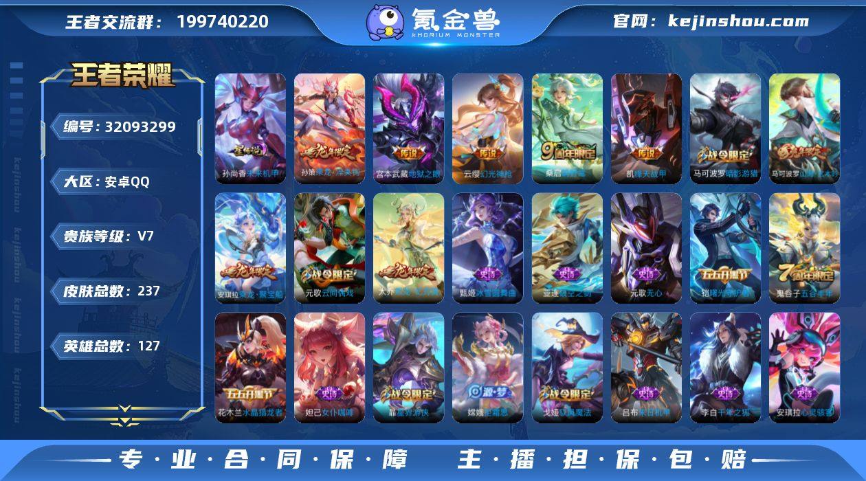 V7 1典藏 5传说 1星元 237皮肤 127英雄 【1水晶】【5传说】宫本武藏-地狱之眼,铠-绛天战甲,孙策-乘龙·淬吴钩,桑启-鸣野蒿,云缨-幻光神枪【1星元】孙尚香-未来机甲【51史诗】元歌-无心,鬼谷子-五谷丰年,赵云-未来纪元,钟无艳-超时空战士,阿轲-节奏热浪,安琪拉-心灵骇客,白起-星夜王子,百里守约-特工魅影,百里玄策-原初追逐者,嫦娥-拒霜思,程咬金-功夫厨神,妲己-女仆咖啡,妲己-魅力维加斯,大乔-猫狗日记,狄仁杰-魔术师,狄仁杰-鹰眼统帅,伽罗-箭羽风息,宫本武藏-鬼剑武藏,花木兰-水晶猎龙者,黄忠-火炮绅士,铠-曙光守护者,兰陵王-暗隐猎兽者,李白-千年之狐,廉颇-地狱岩魂,刘邦-德古拉伯爵,吕布-圣诞狂欢,吕布-末日机甲,马可波罗-暗影游猎,墨子-金属风暴,墨子-龙骑士,孙策-猫狗日记,孙尚香-水果甜心,孙尚香-蔷薇恋人,王昭君-偶像歌手,小乔-缤纷独角兽,亚瑟-心灵战警,嬴政-优雅恋人,元歌-云间偶戏,云中君-纤云弄巧,赵云-皇家上将,甄姬-冰雪圆舞曲,诸葛亮-黄金分割率,扁鹊-奇幻香踪,暃-星界游侠,戈娅-驭风魔法,鲁班七号-蔬乡物语,马可波罗-山海·玄木吟,蒙犽-百解令,大乔-乘龙·忆丹青,安琪拉-乘龙·聚宝船,亚连-破空之剑