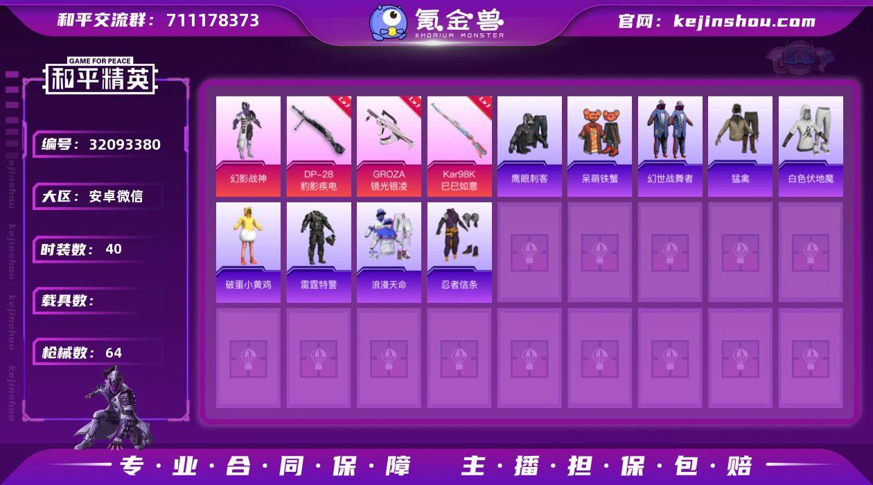 1粉装 5粉枪 40套装 64枪皮 10热门 快乐星愿 潮流炫酷 王牌教练 深蓝色名流 龙的传人 森林游猎者 绯格组合 冰冻风暴 旭日情侣 幻影战神 GROZA-影袭 Kar98K-影袭 M416-红色方程式 M24-影袭 Mini14-穿刺龙虾 DP-28-彩虹符号 AKM-影袭 UZI-影袭 UZI-天降萌叽 UZI-幻影战神 SCAR-L-炫彩节奏 汤姆逊-幻影战神 M249-星之彼岸 Kar98K-巳巳如意(3级) GROZA-镜光银凌(5级) DP-28-豹影疾电(2级) 浪漫天命 鹰眼刺客 破蛋小黄鸡 忍者信条 白色伏地魔 AWM-雷霆特警 AUG-幻影战神 MG3-幻世战舞者 呆萌铁蟹 长空猛禽