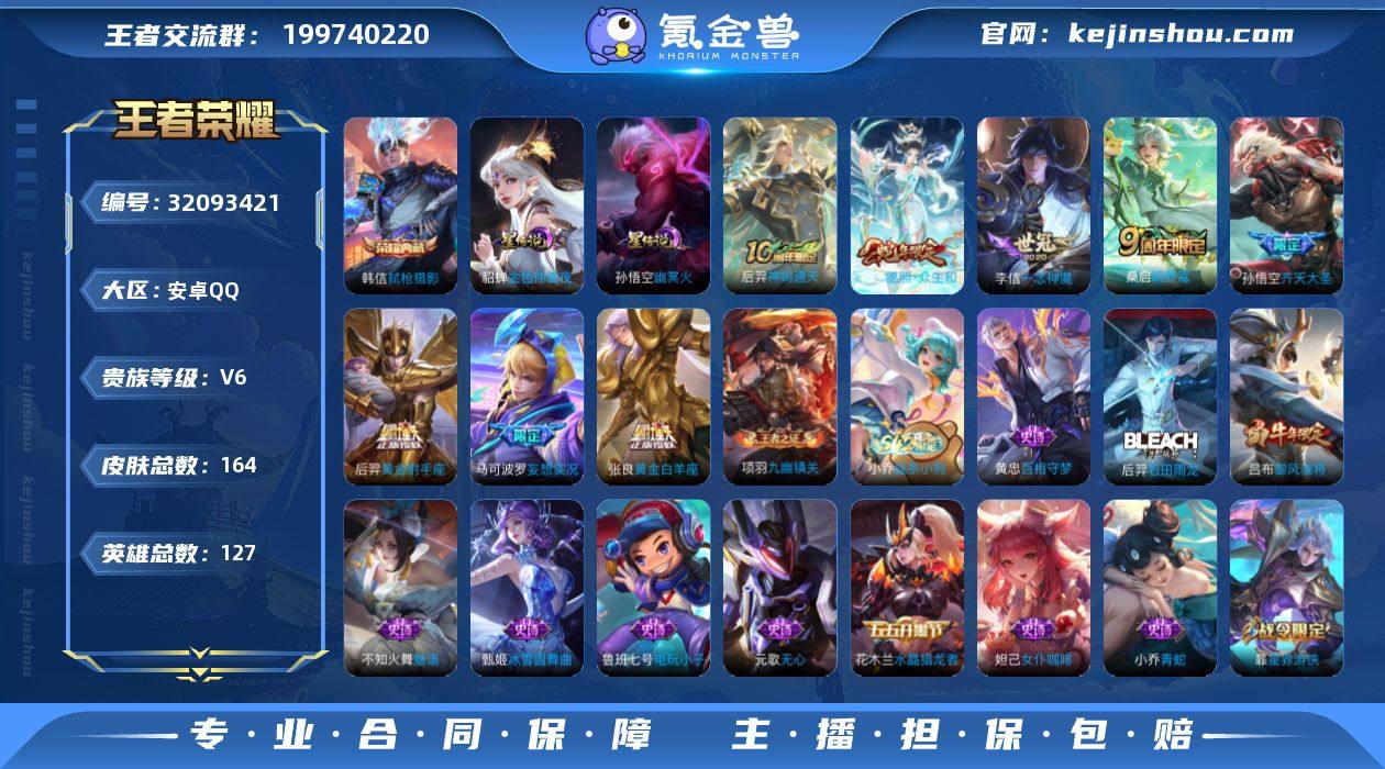 V6 1典藏 8传说 2星元 164皮肤 127英雄 【1水晶】韩信-弑枪猎影【8传说】孙悟空-齐天大圣,后羿-黄金射手座,李信-一念神魔,张良-黄金白羊座,马可波罗-妄想实况,桑启-鸣野蒿,妲己-愿照·众生和,后羿-神树通天【2星元】孙悟空-幽冥火,貂蝉-金色仲夏夜之梦【36史诗】元歌-无心,百里守约-特工魅影,百里玄策-原初追逐者,不知火舞-魅语,曹操-幽灵船长,妲己-女仆咖啡,妲己-魅力维加斯,狄仁杰-魔术师,狄仁杰-鹰眼统帅,伽罗-箭羽风息,宫本武藏-鬼剑武藏,花木兰-水晶猎龙者,刘邦-德古拉伯爵,鲁班七号-电玩小子,吕布-末日机甲,吕布-御风骁将,墨子-金属风暴,孙策-猫狗日记,孙尚香-水果甜心,孙尚香-蔷薇恋人,王昭君-偶像歌手,小乔-缤纷独角兽,小乔-青蛇,雅典娜-冰冠公主,嬴政-优雅恋人,张飞-乱世虎臣,赵云-皇家上将,甄姬-冰雪圆舞曲,钟馗-乐园奇幻夜,诸葛亮-黄金分割率,庄周-高山流水,暃-星界游侠,后羿-石田雨龙,黄忠-百相守梦,小乔-线条小狗,项羽-九幽镇关