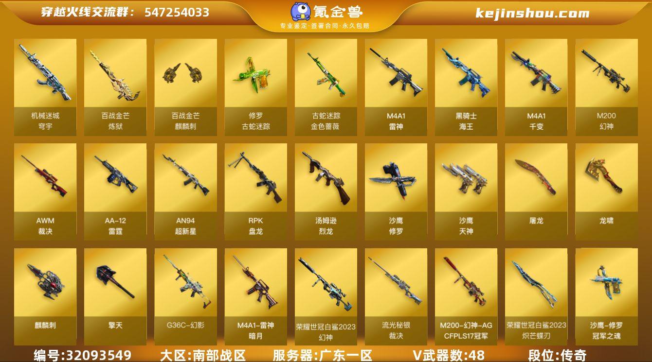 广东一区-49V-4王者武器数-0炫金武器数 【传说武器】:神威天绫 【热门武器】:G36C-幻影*2,M200-幻神,金色蔷薇-古蛇迷踪,修罗-古蛇迷踪,汤姆逊-烈龙*5,RPK-盘龙*5,沙鹰-修罗,炽芒蝶刃-荣耀世冠白鲨2023 皮肤 【王者炫金武器】:王者玄武,王者森力*2,王者冰锋 【音效卡】:沙鹰-修罗-盛典舞曲音效卡*2,炼狱-百战金芒-庆典舞曲音效卡 【皮肤】:幻神-AG-CFPLS17冠军,幻神-荣耀世冠白鲨2023 皮肤,幻神-荣耀世冠EP 皮肤,裁决-流光秘银,裁决-叶芒苍灵 皮肤,雷神-暗月,M4A1-再燃火线,雷神-蓝风铃 皮肤,修罗-冠军之魂,轻型军用手斧-再燃火线,炽芒蝶刃-荣耀世冠白鲨2023 皮肤 【角色】:关小雨,隼,蛇隐宗,葵-阿尔法武装,芳心审判者,风暴女,兰-新年限定,曼陀罗-X,潘多拉-X,蛇姬 【人偶武器】:异变清道夫-蛇影双骄*2,迷你深渊冰龙,迷你生化手雷*2,生化手雷-机甲核心 【暴走生化】:超级对讲机 【挑战大师】:冰龙粉碎者-白马银枪,激光毁灭者III 【英雄级武器】:M4A1-千变,M4A1-雷神,AN94-超新星*2,QBZ03-天罚,G36C-幻影*2,金色蔷薇-古蛇迷踪,黑骑士-海王,王者玄武-觉醒版,机械迷城-穹宇,AWM-裁决,M200-幻神,RPK-盘龙*5,炼狱-百战金芒,汤姆逊-烈龙*5,AA-12-雷霆,沙鹰-修罗,沙鹰-天神*3,柯尔特-荣耀世冠EP,修罗-古蛇迷踪,屠龙*4,龙啸,擎天,麒麟刺,麒麟刺-百战金芒,王者冰锋-觉醒版,高爆手雷-古蛇迷踪,烟雾弹-古蛇迷踪,烟雾弹-荣耀世冠EP*2,烟雾弹-量子之心*2 【道具】:亚洲杯纪念炫彩背包,古蛇迷踪炫彩背包,百战金芒炫彩背包,超级背包,圣拳猎手-炽雪,终极猎手-秦魂将军,虚空终结者-暗域熔岩,女皇终结者-魔龙之吻,绿色巨人,灵魂忍者*2,变异宝贝,妖姬,迷雾幽灵*2,夺命之镰,防化服*3,语音特效-盛典烟火,古蛇迷踪打击特效,蛇隐宗表情,萌萌小...