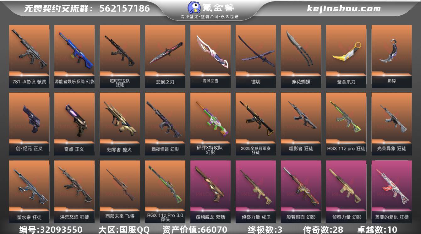 【自带包赔 可赔三倍】:25ak+怜悯精品爽感号,库存价值66070 【限定】: 无畏契约季前邀请赛 悲悯之刃, 2025全球冠军赛 狂徒 【近战】: 无畏契约季前邀请赛 悲悯之刃, 流风回雪, 紫金爪刀, 嘟昂嘟昂超弹力水球拳套, 镭切, 影钩, 穿花蝴蝶 【狂徒】: 光荣异象 狂徒, RGX 11z Pro 狂徒, 盖世英雄 狂徒, 噬影者 狂徒, 冰点凝冻 狂徒, 2025全球冠军赛 狂徒, 滋滋X特攻队 狂徒, 超时空卫队 狂徒, 洪荒怒焰 狂徒, 塑水宗 狂徒, 盖亚的复仇 狂徒, 般若假面//2.0 狂徒 【幻影】: 侦察力量 幻影, 般若假面 幻影, 砰砰X特攻队 幻影, 黯夜怪谈 幻影, 源能者娱乐系统 幻影 【冥驹】: 滋滋X特攻队 冥驹, 离子武器 冥驹 【正义】: 创·纪元 正义, 奇点 正义 【戍卫】: 侦察力量 戍卫 【獠犬】: 归零者 獠犬 【鬼魅】: 耀鳞威龙 鬼魅 【骇灵】: 781-A协议 骇灵 【飞将】: 西部未来 飞将 【莽侠】: RGX 11z Pro//3.0 莽侠 【充值总皮肤】: 光荣异象 狂徒, 无畏契约季前邀请赛 悲悯之刃, RGX 11z Pro 狂徒, 流风回雪, 盖世英雄 狂徒, 侦察力量 幻影, 噬影者 狂徒, 冰点凝冻 狂徒, 般若假面 幻影, 紫金爪刀, 2025全球冠军赛 狂徒, 砰砰X特攻队 幻影, 西部未来 飞将, RGX 11z Pro//3.0 莽侠, 嘟昂嘟昂超弹力水球拳套, 镭切, 781-A协议 骇灵, 创·纪元 正义, 超时空卫队 狂徒, 离子武器 冥驹, 黯夜怪谈 幻影, 洪荒怒焰 狂徒, 归零者 獠犬, 侦察力量 戍卫, 影钩, 源能者娱乐系统 幻影, 塑水宗 狂徒, 盖亚的复仇 狂徒, 奇点 正义, 穿花蝴蝶, 耀鳞威龙 鬼魅, 般若假面//2.0 狂徒 【概要】: 总皮肤 100 终极3 传奇 28 卓越10 刀皮7 英雄 28 LV185 历史最高:钻石 当前段位:钻石 已使用1320 R点 剩余30 R点 不可二次 卡面、挂饰、其他皮肤请看截图 道具、段位等以实际验号为准。如账号因没有维护,赛季更新等不可抗因素发生...