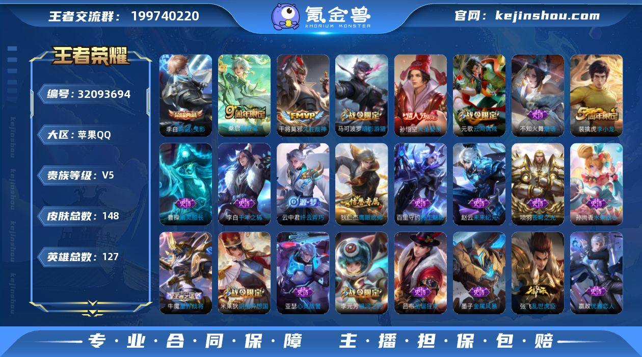 V5 1典藏 2传说 148皮肤 127英雄 【1水晶】李白-鸣剑·曳影【2传说】干将莫邪-久胜战神,桑启-鸣野蒿【26史诗】赵云-未来纪元,百里守约-特工魅影,不知火舞-魅语,曹操-幽灵船长,妲己-魅力维加斯,狄仁杰-鹰眼统帅,李白-千年之狐,李元芳-银河之约,刘禅-天才门将,吕布-圣诞狂欢,马可波罗-暗影游猎,米莱狄-胡桃异想国,墨子-金属风暴,裴擒虎-李小龙,孙尚香-水果甜心,孙悟空-大圣娶亲,王昭君-偶像歌手,项羽-苍穹之光,亚瑟-心灵战警,嬴政-摇滚巨星,嬴政-优雅恋人,元歌-云间偶戏,云中君-纤云弄巧,张飞-乱世虎臣,赵云-皇家上将,牛魔-星界战将