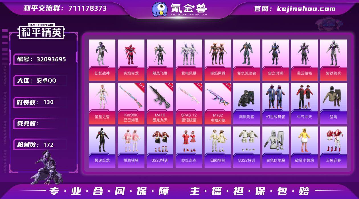 10粉装 4粉枪 1稀有装备 130套装 172枪皮 30热门 奇异狩猎者 复仇流浪者 宙之时溯 星云暗核 紫钛骑兵 炙焰赤龙 飓风飞鹰 紫电风暴 赤焰黑爵 幻影战神 M416-墨龙九天(3级) M762-电糖天使(5级) SPAS-12-蜜语绒猫(6级) Kar98K-巳巳如意(5级) 鹰眼刺客 破蛋小黄鸡 极速红龙 白色伏地魔 SS27特训 SS26特训 SS25特训 SS23特训 SS22特训 Mk14-纯梦嫁纱 Mini14-梦幻火箭 M762-橘柚倾心 M24-未来战士 SCAR-L-玉兔迎春 GROZA-田园牧歌 M762-天降萌叽 Mk47-乌木金纹 UZI-娇憨猪猪 UMP45-蓝色火焰 DBS-彩虹符号 M249-彩虹符号 MG3-幻世战舞者 M416-紫翼圣骑 M416-蓝色火焰 GROZA-彩虹符号 长空猛禽 牛气冲天 霓虹街区 妙红点点 光之冒险尾迹 粉色滑翔尾迹 龙翔九天飞行器
