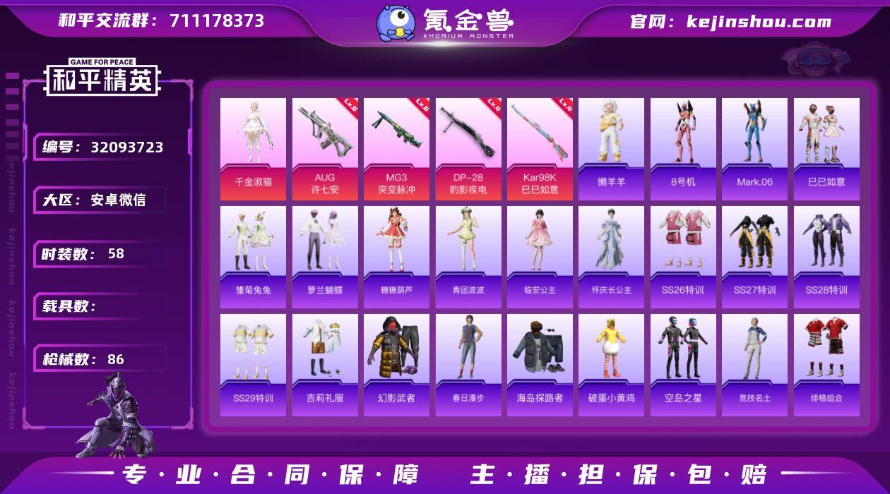 安卓 微信-1粉装-4特效枪-0载具-0粉色飞行器-24126热力值-5王牌印记-58套装-86枪皮 【热门品类】:角色-8号机,角色-Mark.06 【粉色套装】:角色-千金淑猫 【粉色枪皮等级】:AUG-许七安(六级),Kar98K-巳巳如意(四级),DP-28-豹影疾电(四级),MG3-突变脉冲(六级) 【粉色枪皮】:AUG-许七安,Kar98K-巳巳如意,DP-28-豹影疾电,MG3-突变脉冲 【粉色降落伞】:精灵梦叶罗丽降落伞,临安公主降落伞 【稀有套装】:套装-巳巳如意,套装-马上有钱,套装-雏菊兔兔,套装-萝兰蝴蝶,套装-糖糖葫芦,套装-青团波波,角色-临安公主,角色-怀庆长公主,玩偶服-懒羊羊 【稀有枪皮】:AKM-彩虹符号,M416-红色方程式,AUG-天降萌叽,AUG-耀粉歌者,M762-彩虹符号,蜜獾-天降萌叽,蜜獾-虎痴许褚,UZI-啾咪啾咪,UZI-天降萌叽,UZI-炫彩节奏,UMP45-蓝色火焰,汤姆逊-炫彩节奏,P90-巳巳如意,Kar98K-红色方程式,M24-影袭,Mini14-炫彩节奏,Mini14-耀粉歌者,S686-彩虹符号,S686-生命誓言,S686-红色方程式,S686-巳巳如意,S686-千金淑猫,DP-28-彩虹符号,MG3-幻世战舞者,MG3-智耀战神,短管霰弹-竹节火铳,蝎式手枪-千金淑猫,大砍刀-黑金刀,破片手榴弹-巳巳如意 【其他套装】:套装-SS26特训,套装-SS27特训,套装-SS28特训,套装-SS29特训,套装-吉莉礼服,套装-幻影武者,套装-春日漫步,套装-海岛探路者,套装-破蛋小黄鸡,套装-空岛之星,套装-竞技名士,套装-绯格组合,套装-缤纷果语,套装-街头潮人,套装-长空猛禽,套装-霓虹街区,套装-青涩时光,套装-魅力单车,套装-黑色伏地魔,套装-漫步者,角色-冰公主,套装-纯真浪花,套装-热情海星,套装-曼妙人鱼,角色-8号机,角色-Mark.06 【营地ID】:960913810