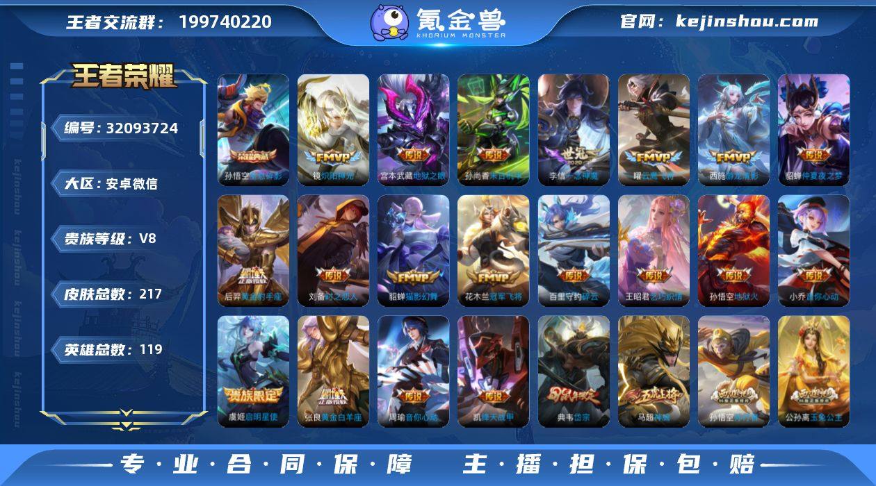 V8 1典藏 19传说 217皮肤 119英雄 【1水晶】孙悟空-全息碎影【19传说】百里守约-碎云,貂蝉-仲夏夜之梦,貂蝉-猫影幻舞,宫本武藏-地狱之眼,后羿-黄金射手座,花木兰-冠军飞将,镜-炽阳神光,铠-绛天战甲,李信-一念神魔,刘备-时之恋人,孙尚香-末日机甲,孙悟空-地狱火,王昭君-乞巧织情,西施-游龙清影,小乔-音你心动,虞姬-启明星使,张良-黄金白羊座,周瑜-音你心动,曜-云鹰飞将【54史诗】鬼谷子-五谷丰年,赵云-未来纪元,貂蝉-唤灵魅影,澜-赏金猎手,公孙离-玉兔公主,阿轲-节奏热浪,安琪拉-心灵骇客,白起-星夜王子,百里守约-特工魅影,不知火舞-魅语,曹操-幽灵船长,程咬金-功夫厨神,妲己-女仆咖啡,大乔-白蛇,狄仁杰-魔术师,狄仁杰-鹰眼统帅,典韦-岱宗,貂蝉-圣诞恋歌,宫本武藏-鬼剑武藏,后羿-辉光之辰,花木兰-水晶猎龙者,橘右京-修罗,铠-曙光守护者,兰陵王-暗隐猎兽者,李白-千年之狐,李元芳-逐浪之夏,廉颇-地狱岩魂,刘邦-德古拉伯爵,刘禅-绅士熊喵,刘禅-天才门将,露娜-紫霞仙子,吕布-圣诞狂欢,吕布-末日机甲,马超-神威,墨子-金属风暴,孙策-猫狗日记,孙尚香-水果甜心,孙尚香-时之恋人,孙悟空-孙行者,王昭君-偶像歌手,西施-诗语江南,夏侯惇-乘风破浪,项羽-苍穹之光,小乔-缤纷独角兽,嬴政-摇滚巨星,张飞-乱世虎臣,赵云-皇家上将,甄姬-冰雪圆舞曲,诸葛亮-黄金分割率,百里守约-真我赫兹,鲁班七号-蔬乡物语,镜-青焰无极,蒙犽-百解令,百里守约-百相守梦