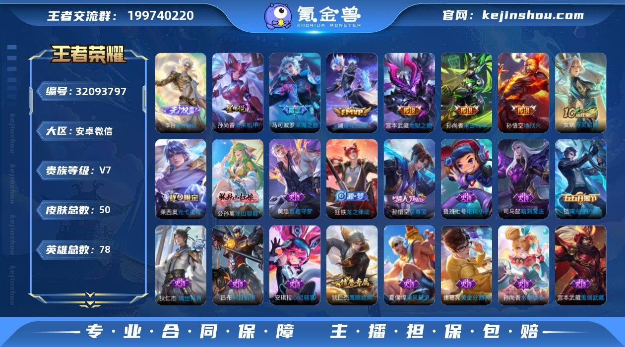 V7 1无双 5传说 1星元 50皮肤 78英雄 【1无双】李白-碎月剑心【5传说】马可波罗-深海之息,宫本武藏-地狱之眼,孙尚香-末日机甲,孙悟空-地狱火,澜-逐花归海【1星元】孙尚香-未来机甲【19史诗】安琪拉-心灵骇客,狄仁杰-魔术师,狄仁杰-鹰眼统帅,宫本武藏-鬼剑武藏,铠-曙光守护者,鲁班七号-电玩小子,吕布-末日机甲,司马懿-暗渊魔法,孙尚香-水果甜心,孙悟空-至尊宝,夏侯惇-乘风破浪,赵云-皇家上将,诸葛亮-黄金分割率,狄仁杰-绮世丹青,狂铁-龙之律动,黄忠-百相守梦,公孙离-涂山容容,女娲-万灵启世,莱西奥-光弋星穹