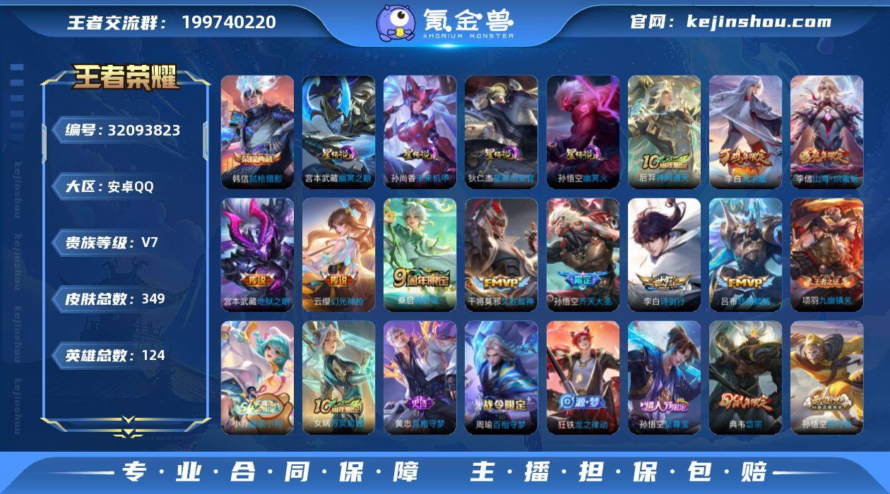 V7 1典藏 10传说 4星元 349皮肤 124英雄 【1水晶】韩信-弑枪猎影【10传说】孙悟空-齐天大圣,李信-山海·炽霜斩,李白-诗剑行,干将莫邪-久胜战神,宫本武藏-地狱之眼,李白-凤求凰,吕布-怒海麟威,桑启-鸣野蒿,云缨-幻光神枪,后羿-神树通天【4星元】狄仁杰-星际治安官,孙尚香-未来机甲,孙悟空-幽冥火,宫本武藏-幽冥之眼【76史诗】元歌-无心,鬼谷子-五谷丰年,赵云-未来纪元,阿轲-节奏热浪,安琪拉-心灵骇客,白起-星夜王子,百里守约-特工魅影,百里玄策-原初追逐者,曹操-幽灵船长,蔡文姬-繁星吟游,程咬金-功夫厨神,妲己-女仆咖啡,狄仁杰-魔术师,狄仁杰-鹰眼统帅,典韦-岱宗,貂蝉-圣诞恋歌,伽罗-天狼溯光者,宫本武藏-鬼剑武藏,关羽-冰锋战神,韩信-白龙吟,花木兰-水晶猎龙者,橘右京-修罗,铠-曙光守护者,兰陵王-暗隐猎兽者,老夫子-航海奇遇记,李白-千年之狐,李元芳-逐浪之夏,李元芳-银河之约,廉颇-地狱岩魂,刘邦-德古拉伯爵,露娜-紫霞仙子,鲁班七号-狮舞东方,吕布-圣诞狂欢,吕布-末日机甲,米莱狄-胡桃异想国,墨子-金属风暴,上官婉儿-梁祝,裴擒虎-李小龙,孙策-猫狗日记,孙尚香-水果甜心,孙尚香-蔷薇恋人,孙悟空-大圣娶亲,孙悟空-至尊宝,孙悟空-孙行者,王昭君-偶像歌手,夏侯惇-乘风破浪,项羽-苍穹之光,小乔-缤纷独角兽,小乔-青蛇,雅典娜-冰冠公主,雅典娜-黎明之约,亚瑟-心灵战警,杨戬-天秀·启明,嬴政-摇滚巨星,嬴政-暗夜贵公子,嬴政-白昼王子,云中君-纤云弄巧,张飞-乱世虎臣,赵云-皇家上将,甄姬-冰雪圆舞曲,甄姬-游园惊梦,诸葛亮-黄金分割率,梦奇-顽趣,鲁班七号-蔬乡物语,马可波罗-山海·玄木吟,镜-青焰无极,蒙犽-百解令,蒙恬-荣光圣徽,百里守约-百相守梦,弈星-万物之道,狂铁-龙之律动,周瑜-百相守梦,黄忠-百相守梦,小乔-线条小狗,项羽-九幽镇关,女娲-万灵启世