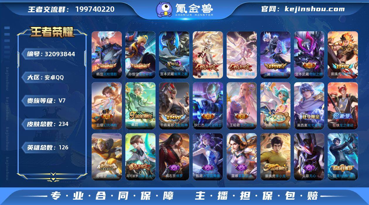V7 2典藏 10传说 1星元 234皮肤 126英雄 【2水晶】孙悟空-全息碎影,韩信-弑枪猎影【10传说】狄仁杰-超时空战士,干将莫邪-久胜战神,宫本武藏-地狱之眼,王昭君-乞巧织情,澜-逐花归海,桑启-鸣野蒿,云缨-幻光神枪,裴擒虎-祥瑞亨通,虞姬-愿照·岁时盈,澜-愿照·九州拓【1星元】宫本武藏-幽冥之眼【46史诗】元歌-无心,阿轲-节奏热浪,阿轲-迷踪丽影,安琪拉-心灵骇客,白起-星夜王子,百里守约-特工魅影,百里玄策-原初追逐者,蔡文姬-舞动绿茵,曹操-幽灵船长,程咬金-功夫厨神,妲己-魅力维加斯,狄仁杰-魔术师,狄仁杰-鹰眼统帅,伽罗-箭羽风息,宫本武藏-鬼剑武藏,花木兰-水晶猎龙者,橘右京-修罗,铠-曙光守护者,兰陵王-暗隐猎兽者,李白-千年之狐,李元芳-逐浪之夏,廉颇-地狱岩魂,刘禅-绅士熊喵,刘禅-天才门将,露娜-紫霞仙子,吕布-圣诞狂欢,上官婉儿-梁祝,裴擒虎-李小龙,孙策-猫狗日记,孙尚香-水果甜心,孙悟空-孙行者,王昭君-偶像歌手,雅典娜-冰冠公主,亚瑟-心灵战警,嬴政-暗夜贵公子,云中君-纤云弄巧,赵云-皇家上将,甄姬-冰雪圆舞曲,诸葛亮-黄金分割率,鲁班七号-蔬乡物语,马可波罗-山海·玄木吟,镜-青焰无极,百里守约-百相守梦,狂铁-龙之律动,小乔-线条小狗,莱西奥-光弋星穹