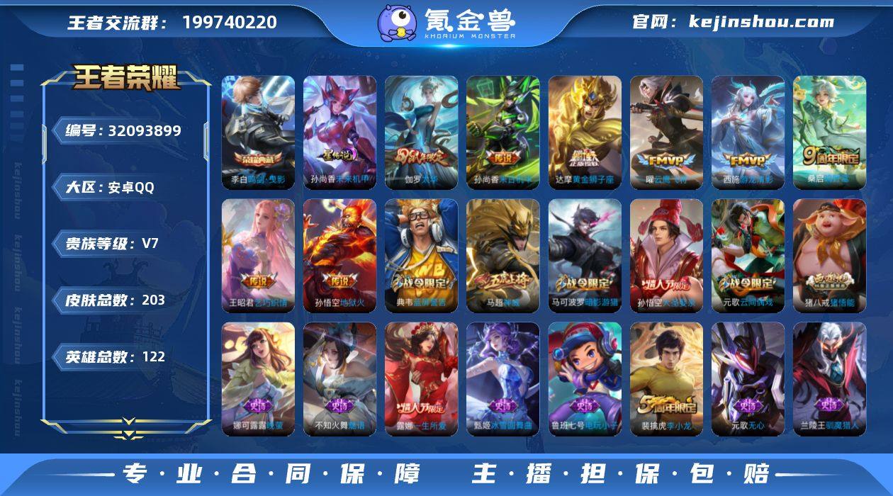 V7 1典藏 8传说 1星元 203皮肤 122英雄 【1水晶】李白-鸣剑·曳影【8传说】达摩-黄金狮子座,伽罗-太华,孙尚香-末日机甲,孙悟空-地狱火,王昭君-乞巧织情,西施-游龙清影,曜-云鹰飞将,桑启-鸣野蒿【1星元】孙尚香-未来机甲【52史诗】元歌-无心,鬼谷子-五谷丰年,阿轲-暗夜猫娘,安琪拉-心灵骇客,白起-星夜王子,百里玄策-原初追逐者,不知火舞-魅语,蔡文姬-繁星吟游,程咬金-功夫厨神,妲己-女仆咖啡,妲己-魅力维加斯,狄仁杰-魔术师,狄仁杰-鹰眼统帅,典韦-蓝屏警告,貂蝉-圣诞恋歌,公孙离-无限星赏官,宫本武藏-鬼剑武藏,韩信-白龙吟,花木兰-水晶猎龙者,花木兰-瑞麟志,兰陵王-暗隐猎兽者,兰陵王-驯魔猎人,老夫子-航海奇遇记,李白-千年之狐,李元芳-逐浪之夏,刘邦-德古拉伯爵,露娜-一生所爱,鲁班七号-电玩小子,吕布-末日机甲,马超-神威,马可波罗-暗影游猎,米莱狄-胡桃异想国,墨子-金属风暴,娜可露露-晚萤,上官婉儿-梁祝,裴擒虎-李小龙,孙策-猫狗日记,孙尚香-水果甜心,孙悟空-大圣娶亲,王昭君-偶像歌手,小乔-缤纷独角兽,雅典娜-冰冠公主,雅典娜-黎明之约,杨玉环-遇见飞天,嬴政-白昼王子,元歌-云间偶戏,云中君-纤云弄巧,赵云-皇家上将,甄姬-冰雪圆舞曲,猪八戒-猪悟能,庄周-高山流水,刘禅-电玩·爆裂旋风