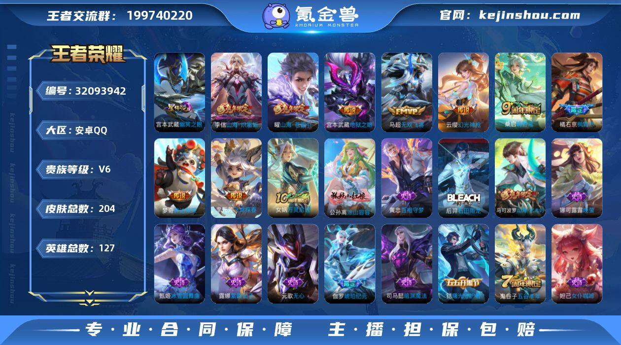 V6 9传说 1星元 204皮肤 127英雄 【9传说】曜-山海·苍雷引,李信-山海·炽霜斩,橘右京-枫霜尽,马超-无双飞将,宫本武藏-地狱之眼,李元芳-飞鸢探春,梦奇-胖达荣荣,桑启-鸣野蒿,云缨-幻光神枪【1星元】宫本武藏-幽冥之眼【44史诗】元歌-无心,鬼谷子-五谷丰年,赵云-未来纪元,安琪拉-心灵骇客,白起-星夜王子,百里守约-特工魅影,曹操-幽灵船长,程咬金-功夫厨神,妲己-女仆咖啡,妲己-魅力维加斯,狄仁杰-魔术师,狄仁杰-鹰眼统帅,干将莫邪-真爱魔法,宫本武藏-鬼剑武藏,镜-匿光追影者,铠-曙光守护者,兰陵王-暗隐猎兽者,李元芳-逐浪之夏,廉颇-寅虎·御盾,刘禅-天才门将,露娜-紫霞仙子,吕布-末日机甲,墨子-金属风暴,娜可露露-晚萤,上官婉儿-梁祝,司马懿-暗渊魔法,孙尚香-水果甜心,王昭君-偶像歌手,夏侯惇-乘风破浪,小乔-缤纷独角兽,嬴政-摇滚巨星,云中君-纤云弄巧,赵云-皇家上将,甄姬-冰雪圆舞曲,诸葛亮-黄金分割率,暃-星界游侠,梦奇-顽趣,马可波罗-山海·玄木吟,蒙恬-荣光圣徽,伽罗-琥珀纪元,后羿-石田雨龙,黄忠-百相守梦,公孙离-涂山容容,女娲-万灵启世