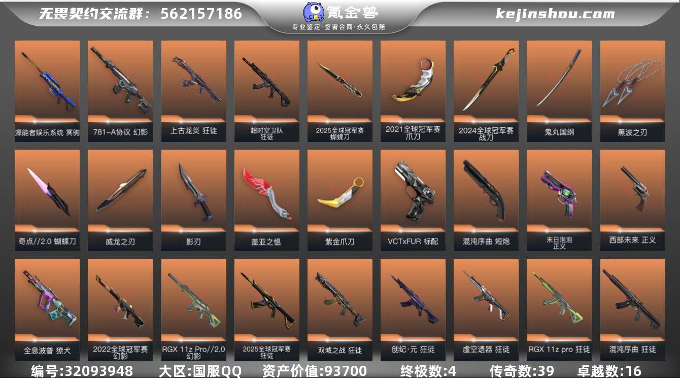 【自带包赔 可赔三倍】:库存价值 93700 21 24 25 刀皮 超多热门狂徒性价比库存号 可更改二次实名 入手无忧 【限定】: 2025全球冠军赛 蝴蝶刀, 2025全球冠军赛 狂徒, 2022全球冠军赛 幻影, 双城之战 狂徒, 2024全球冠军赛 战刀, 2021全球冠军赛 爪刀 【近战】: 2025全球冠军赛 蝴蝶刀, 嘟昂嘟昂超弹力水球拳套, 黑波之刃, 鬼丸国纲, 影刃, 奇点//2.0 蝴蝶刀, 紫金爪刀, 2024全球冠军赛 战刀, 2021全球冠军赛 爪刀, 威龙之刃, 盖亚之愠 【狂徒】: 超时空卫队 狂徒, 2025全球冠军赛 狂徒, RGX 11z Pro 狂徒, 上古龙炎 狂徒, 离子武器//2.0 狂徒, 虚空遗器 狂徒, 创·纪元 狂徒, 双城之战 狂徒, 掠影 狂徒, 混沌序曲 狂徒, 海洋之星 狂徒, 全息波普//2.0 狂徒, 洪荒怒焰 狂徒, 耀鳞威龙 狂徒 【幻影】: 2022全球冠军赛 幻影, 侦察力量 幻影, RGX 11z Pro//2.0 幻影, 离子武器 幻影, 781-A协议 幻影 【冥驹】: 堕天遗武 冥驹, 掠影 冥驹, 源能者娱乐系统 冥驹 【正义】: 末日泡泡 正义, 西部未来 正义, 掠影 正义, 离子武器 正义 【戍卫】: 掠影 戍卫, 天界神兵 戍卫 【獠犬】: 全息波普 獠犬 【鬼魅】: 掠影//2.0 鬼魅, 天界神兵 鬼魅, 耀鳞威龙 鬼魅 【骇灵】: 紫阙金琅 骇灵 【标配】: VCT x FUR 标配 【短炮】: 混沌序曲 短炮 【飞将】: 西部未来 飞将, 塑水宗 飞将 【奥丁】: 西部未来 奥丁 【莽侠】: RGX 11z Pro//3.0 莽侠 【概要】: 总皮肤196 终极4 传奇 39 卓越 16刀皮11 英雄28 LV195 历史最高: 铂金当前段位:未定级 已使用 2110R点 剩余 50 R点 可二次 卡面、挂饰、其他皮肤请看截图 道具、段位等以实际验号为准。如账号因没有维护,赛季更新等不可抗因素发生变化,不属于账号质量问题"