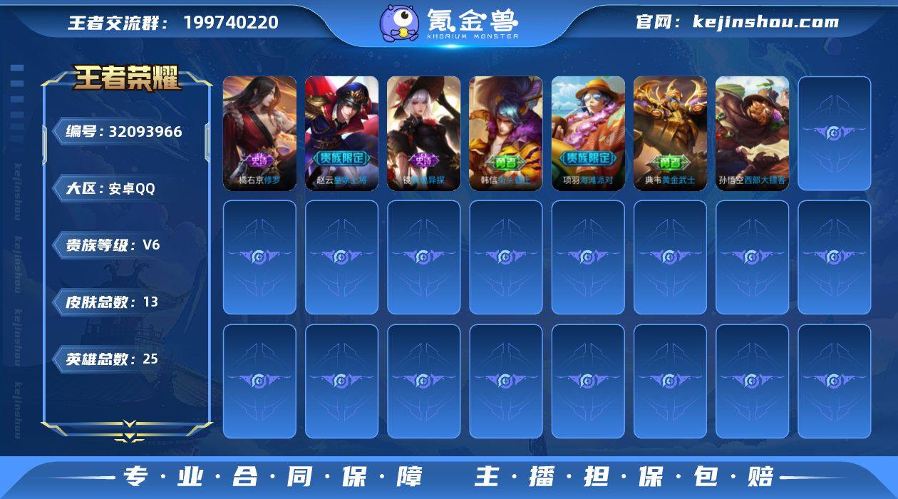 V6 1无双 1传说 13皮肤 25英雄 【1无双】【1传说】【3史诗】橘右京-修罗,赵云-皇家上将,镜-玫瑰异探