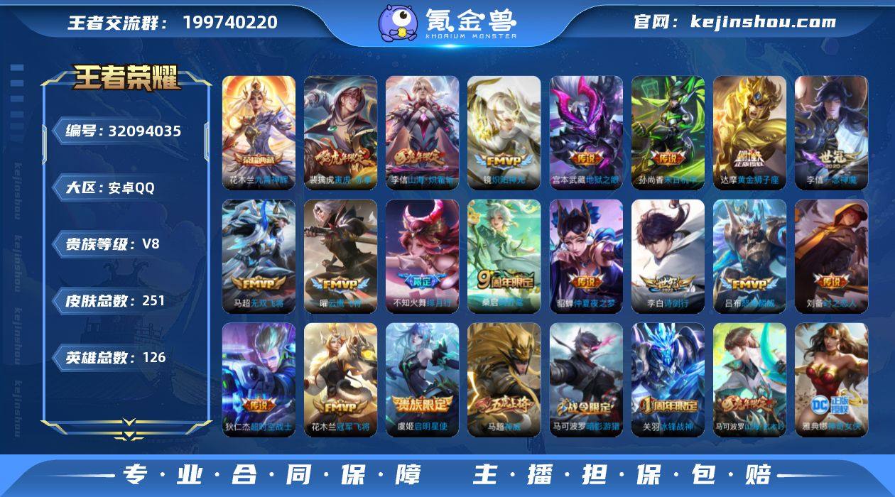 V8 1典藏 18传说 251皮肤 126英雄 【1水晶】花木兰-九霄神辉【18传说】李信-山海·炽霜斩,李白-诗剑行,不知火舞-绯月行,马超-无双飞将,达摩-黄金狮子座,狄仁杰-超时空战士,貂蝉-仲夏夜之梦,宫本武藏-地狱之眼,花木兰-冠军飞将,镜-炽阳神光,李信-一念神魔,刘备-时之恋人,裴擒虎-寅虎·赤拳,孙尚香-末日机甲,虞姬-启明星使,吕布-怒海麟威,曜-云鹰飞将,桑启-鸣野蒿【52史诗】墨子-降魔,元歌-无心,上官婉儿-神器·万象笔,鬼谷子-五谷丰年,赵云-未来纪元,钟无艳-超时空战士,貂蝉-唤灵魅影,夏洛特-永昼,白起-星夜王子,百里守约-特工魅影,百里玄策-原初追逐者,曹操-幽灵船长,程咬金-功夫厨神,妲己-女仆咖啡,妲己-魅力维加斯,狄仁杰-魔术师,狄仁杰-鹰眼统帅,貂蝉-圣诞恋歌,公孙离-无限星赏官,宫本武藏-鬼剑武藏,关羽-冰锋战神,花木兰-水晶猎龙者,橘右京-修罗,铠-曙光守护者,老夫子-航海奇遇记,李元芳-逐浪之夏,李元芳-银河之约,廉颇-地狱岩魂,吕布-圣诞狂欢,吕布-末日机甲,马超-神威,马可波罗-暗影游猎,蒙犽-狂想玩偶喵,墨子-金属风暴,娜可露露-晚萤,裴擒虎-李小龙,孙策-猫狗日记,孙尚香-水果甜心,王昭君-偶像歌手,小乔-缤纷独角兽,雅典娜-冰冠公主,雅典娜-神奇女侠,雅典娜-黎明之约,亚瑟-心灵战警,杨戬-天秀·启明,赵云-皇家上将,甄姬-冰雪圆舞曲,诸葛亮-黄金分割率,梦奇-顽趣,马可波罗-山海·玄木吟,蒙恬-荣光圣徽,亚连-破空之剑