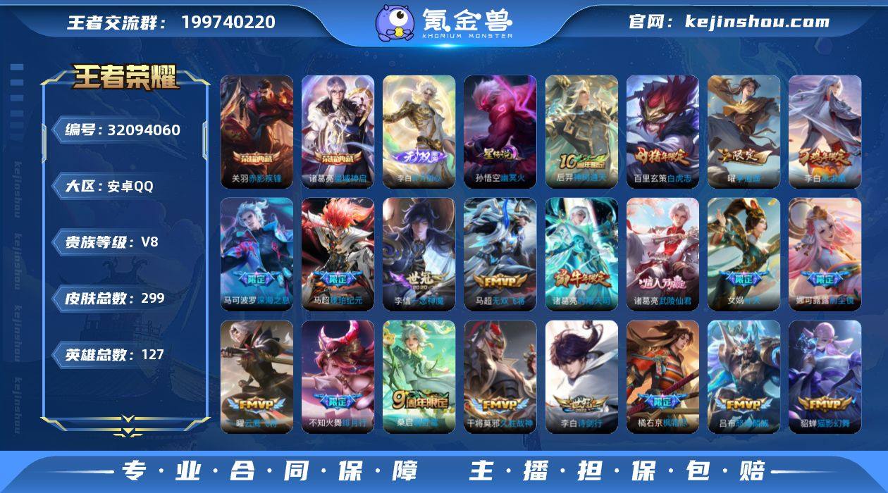 可换绑【热门质量精品号·关羽诸葛亮典藏·李白无双·马超琥珀纪元·绯月行·前尘镜·枫霜尽·520孙策·女娲补天·李逍遥·白虎志·凤求凰·神威】9按键,2星传说,1天幕,8王者印记,五级铭文230,可二次KK8731,安卓Q-V8-299皮肤-2典藏皮肤-1无双-26传说-73史诗【英雄全皮】:娜可露露全皮,橘右京全皮 【荣耀典藏】:诸葛亮星域神启,关羽赤影疾锋【无双皮肤】:李白碎月剑心【星元皮肤】:孙悟空幽冥火,刘备时之思念【天幕】:挚爱童话天幕【传说皮肤】:后羿神树通天,桑启鸣野蒿,马超琥珀纪元,吕布怒海麟威,李白诗剑行,不知火舞绯月行,橘右京枫霜尽,娜可露露前尘镜,马可波罗深海之息,马超无双飞将,孙策挚爱之约,女娲补天,赵云淬星耀世,曜李逍遥 ,小乔音你心动,诸葛亮时雨天司,虞姬启明星使,曜云鹰飞将,李信一念神魔,貂蝉猫影幻舞,干将莫邪久胜战神,百里玄策白虎志,花木兰冠军飞将,诸葛亮武陵仙君,李白凤求凰,孙悟空地狱火【限定皮肤】:白起狰,姜子牙天穹之誓,狄仁杰阴阳师,虞姬凯尔特女王,赵云皇家上将,嬴政白昼王子,孙尚香蔷薇恋人,钟无艳超时空战士,扁鹊炼金王,白起夜都怪侠,芈月重明,芈月幻夜卜梦,吕布猎兽之王,元歌无心,夏侯惇朔风刀,甄姬幽恒,甄姬落雪兰心,曹操烛龙,典韦穷奇,马可波罗暗影游猎,马可波罗深海之息,狄仁杰魔术师,狄仁杰万华元夜,达摩沙漠行僧,项羽海滩派对,老夫子醍醐杖,貂蝉逐梦之音,程咬金演武夺筹,露娜一生所爱,王昭君午后时光,兰陵王金庭之子,花木兰瑞麟志,不知火舞绯月行,娜可露露前尘镜,橘右京枫霜尽,孙悟空大圣娶亲,牛魔御旌,后羿辉光之辰,李元芳云中旅人,虞姬启明星使,钟馗驱傩正仪,女娲补天,雅典娜单词大作战,太乙真人饕餮,鬼谷子原初探秘者,鬼谷子五谷丰年,诸葛亮武陵仙君,诸葛亮时雨天司,黄忠火炮绅士,百里玄...