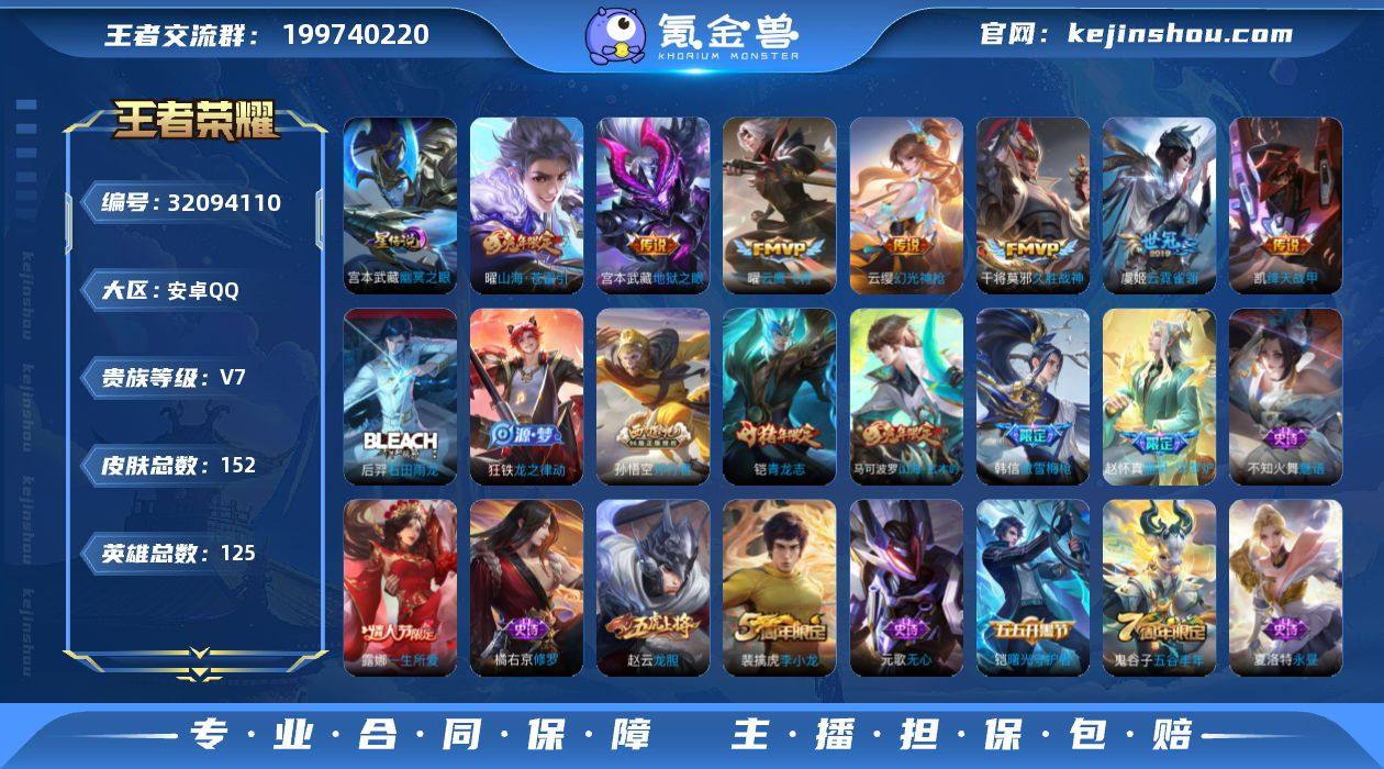 V7 7传说 1星元 152皮肤 125英雄 【7传说】曜-山海·苍雷引,干将莫邪-久胜战神,宫本武藏-地狱之眼,铠-绛天战甲,虞姬-云霓雀翎,曜-云鹰飞将,云缨-幻光神枪【1星元】宫本武藏-幽冥之眼【37史诗】元歌-无心,鬼谷子-五谷丰年,夏洛特-永昼,阿轲-节奏热浪,不知火舞-魅语,曹操-幽灵船长,蔡文姬-繁星吟游,嫦娥-拒霜思,程咬金-功夫厨神,妲己-女仆咖啡,妲己-魅力维加斯,狄仁杰-魔术师,狄仁杰-鹰眼统帅,貂蝉-圣诞恋歌,宫本武藏-鬼剑武藏,韩信-傲雪梅枪,花木兰-水晶猎龙者,橘右京-修罗,铠-曙光守护者,铠-青龙志,兰陵王-暗隐猎兽者,露娜-一生所爱,吕布-末日机甲,墨子-金属风暴,裴擒虎-李小龙,孙尚香-水果甜心,孙悟空-孙行者,夏侯惇-乘风破浪,小乔-缤纷独角兽,赵云-皇家上将,赵云-龙胆,诸葛亮-黄金分割率,扁鹊-奇幻香踪,马可波罗-山海·玄木吟,赵怀真-器灵·浮梦炉,狂铁-龙之律动,后羿-石田雨龙