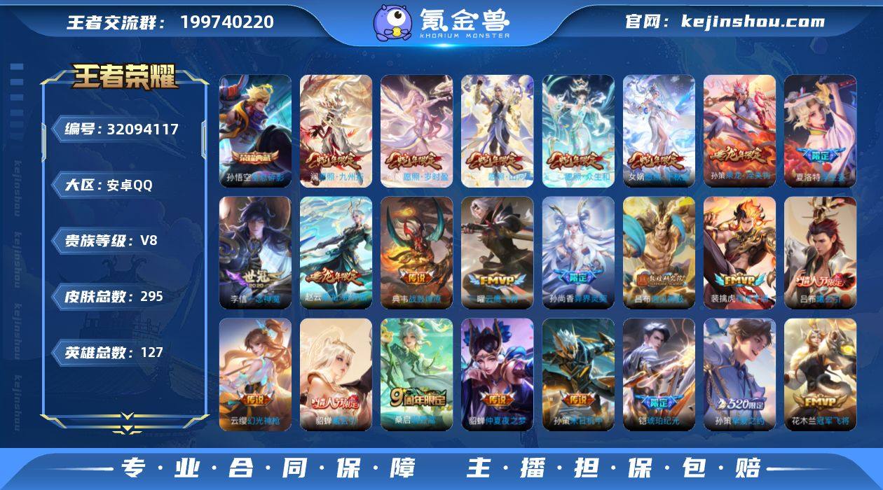 V8 1典藏 27传说 295皮肤 127英雄 【1水晶】孙悟空-全息碎影【27传说】孙策-挚爱之约,貂蝉-仲夏夜之梦,花木兰-冠军飞将,李信-一念神魔,孙策-末日机甲,孙尚香-异界灵契,孙悟空-地狱火,虞姬-启明星使,花木兰-燃星之曲,夏洛特-浮生妄,典韦-战鼓燎原,孙策-乘龙·淬吴钩,赵云-乘龙·铭钟鼎,貂蝉-曦玄引,吕布-曦玄引,吕布-遇见神鼓,铠-琥珀纪元,曜-云鹰飞将,桑启-鸣野蒿,云缨-幻光神枪,裴擒虎-祥瑞亨通,妲己-愿照·众生和,司空震-愿照·山河定,虞姬-愿照·岁时盈,澜-愿照·九州拓,女娲-愿照·千秋盛【79史诗】墨子-降魔,元歌-无心,赵云-未来纪元,钟无艳-超时空战士,狂铁-电玩高手,貂蝉-唤灵魅影,夏洛特-永昼,阿轲-暗夜猫娘,阿轲-节奏热浪,白起-星夜王子,不知火舞-魅语,曹操-幽灵船长,嫦娥-拒霜思,程咬金-功夫厨神,妲己-魅力维加斯,狄仁杰-魔术师,狄仁杰-鹰眼统帅,貂蝉-圣诞恋歌,伽罗-箭羽风息,干将莫邪-真爱魔法,公孙离-无限星赏官,宫本武藏-鬼剑武藏,韩信-傲雪梅枪,花木兰-水晶猎龙者,花木兰-瑞麟志,橘右京-修罗,黄忠-火炮绅士,铠-曙光守护者,兰陵王-暗隐猎兽者,老夫子-航海奇遇记,李白-千年之狐,李元芳-逐浪之夏,廉颇-地狱岩魂,刘邦-德古拉伯爵,刘禅-天才门将,露娜-紫霞仙子,米莱狄-胡桃异想国,墨子-金属风暴,上官婉儿-梁祝,裴擒虎-李小龙,司马懿-暗渊魔法,孙策-猫狗日记,孙尚香-水果甜心,孙尚香-蔷薇恋人,孙尚香-时之恋人,夏侯惇-乘风破浪,项羽-苍穹之光,小乔-缤纷独角兽,雅典娜-冰冠公主,雅典娜-黎明之约,亚瑟-心灵战警,嬴政-摇滚巨星,张飞-乱世虎臣,赵云-皇家上将,甄姬-冰雪圆舞曲,诸葛亮-黄金分割率,庄周-高山流水,刘备-百相守梦,镜-玫瑰异探,沈梦溪-匿光破解者,暃-星界游侠,上官婉儿-群星魔术团,百里守约-真我赫兹,戈娅-驭风魔法,杨玉环-银翎春语,鲁班七号-蔬乡物语,马可波罗-山海·玄木吟,镜-青焰无极,蒙恬-荣光圣徽,伽...