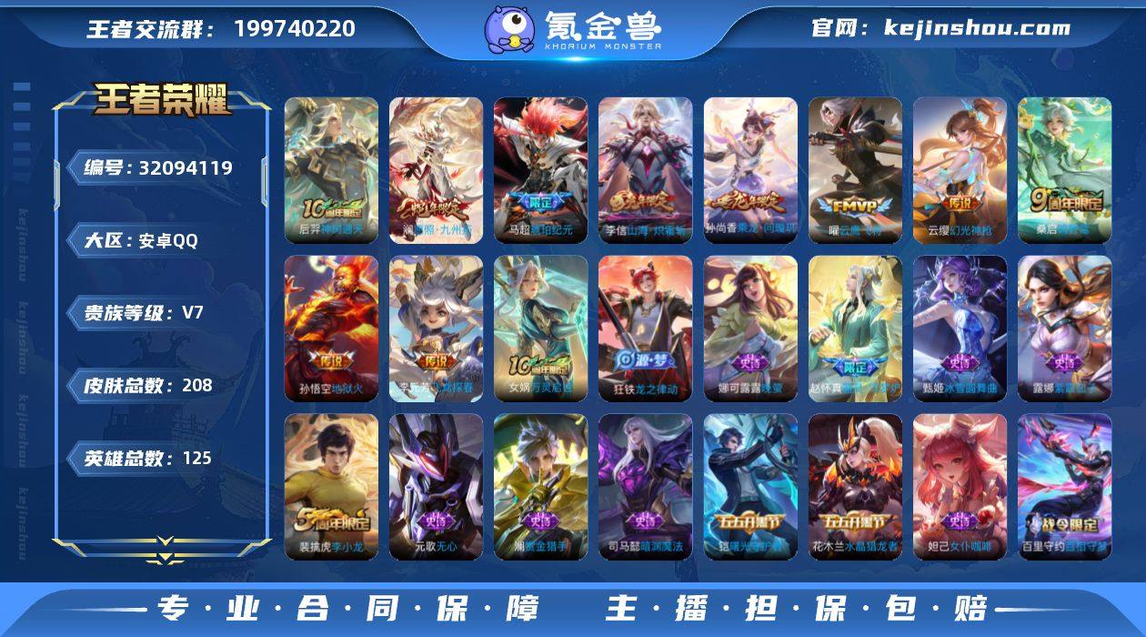 V7 11传说 208皮肤 125英雄 【11传说】李信-山海·炽霜斩,李元芳-飞鸢探春,孙悟空-地狱火,孙尚香-乘龙·问璇玑,马超-琥珀纪元,曜-云鹰飞将,桑启-鸣野蒿,云缨-幻光神枪,澜-愿照·九州拓,后羿-神树通天【46史诗】元歌-无心,赵云-未来纪元,澜-赏金猎手,阿轲-迷踪丽影,曹操-幽灵船长,嫦娥-拒霜思,妲己-女仆咖啡,妲己-魅力维加斯,狄仁杰-魔术师,狄仁杰-鹰眼统帅,貂蝉-圣诞恋歌,宫本武藏-鬼剑武藏,花木兰-水晶猎龙者,铠-曙光守护者,兰陵王-暗隐猎兽者,李元芳-逐浪之夏,露娜-紫霞仙子,吕布-圣诞狂欢,吕布-末日机甲,墨子-金属风暴,娜可露露-晚萤,裴擒虎-李小龙,司马懿-暗渊魔法,孙策-猫狗日记,孙尚香-水果甜心,孙尚香-蔷薇恋人,夏侯惇-乘风破浪,小乔-缤纷独角兽,雅典娜-冰冠公主,亚瑟-心灵战警,嬴政-白昼王子,云中君-纤云弄巧,张飞-乱世虎臣,赵云-皇家上将,甄姬-冰雪圆舞曲,钟馗-乐园奇幻夜,诸葛亮-黄金分割率,百里玄策-超元猎域,扁鹊-奇幻香踪,戈娅-驭风魔法,鲁班七号-蔬乡物语,蒙犽-百解令,百里守约-百相守梦,赵怀真-器灵·浮梦炉,狂铁-龙之律动,女娲-万灵启世