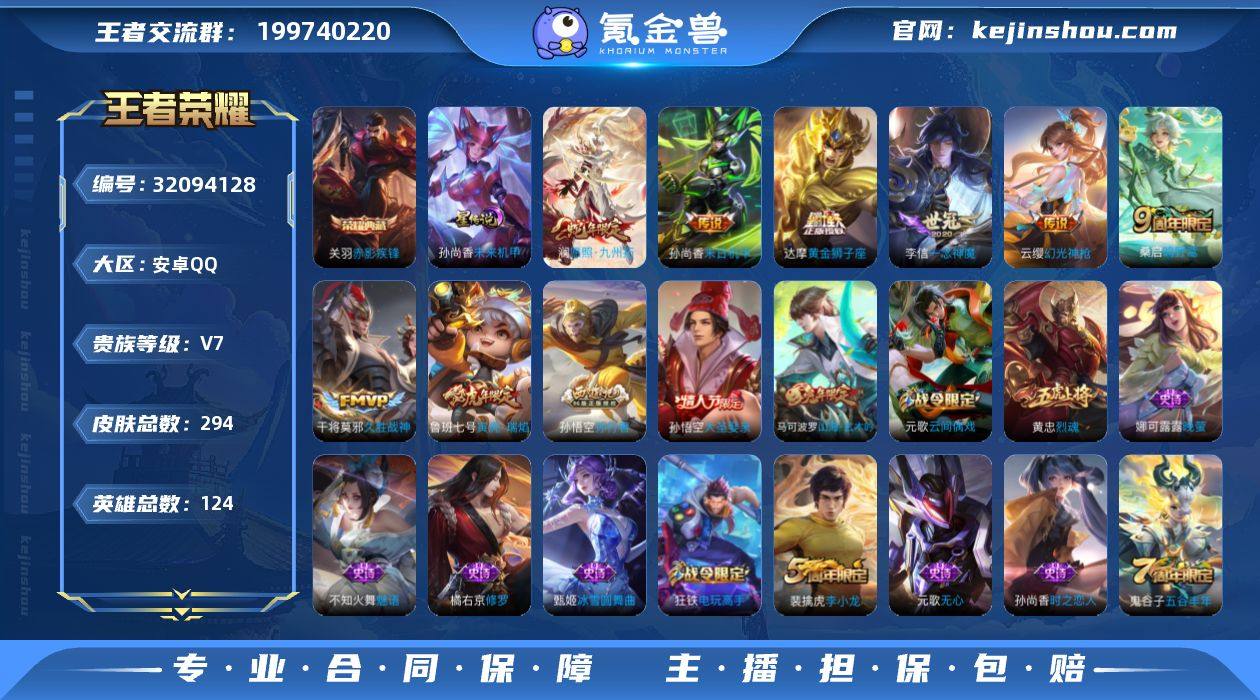 V7 1典藏 8传说 1星元 294皮肤 124英雄 【1水晶】关羽-赤影疾锋【8传说】达摩-黄金狮子座,干将莫邪-久胜战神,李信-一念神魔,鲁班七号-寅虎·瑞焰,孙尚香-末日机甲,桑启-鸣野蒿,云缨-幻光神枪,澜-愿照·九州拓【1星元】孙尚香-未来机甲【65史诗】元歌-无心,鬼谷子-五谷丰年,赵云-未来纪元,钟无艳-超时空战士,狂铁-电玩高手,阿轲-节奏热浪,安琪拉-心灵骇客,白起-星夜王子,百里守约-特工魅影,不知火舞-魅语,蔡文姬-舞动绿茵,曹操-幽灵船长,嫦娥-拒霜思,程咬金-功夫厨神,妲己-女仆咖啡,妲己-魅力维加斯,大乔-猫狗日记,狄仁杰-魔术师,狄仁杰-鹰眼统帅,貂蝉-圣诞恋歌,干将莫邪-真爱魔法,宫本武藏-鬼剑武藏,花木兰-水晶猎龙者,黄忠-烈魂,橘右京-修罗,黄忠-火炮绅士,兰陵王-暗隐猎兽者,老夫子-航海奇遇记,李元芳-逐浪之夏,廉颇-寅虎·御盾,刘邦-德古拉伯爵,刘禅-绅士熊喵,刘禅-天才门将,吕布-圣诞狂欢,吕布-末日机甲,墨子-金属风暴,墨子-龙骑士,娜可露露-晚萤,上官婉儿-梁祝,裴擒虎-李小龙,孙策-猫狗日记,孙尚香-水果甜心,孙尚香-蔷薇恋人,孙悟空-大圣娶亲,孙尚香-时之恋人,孙悟空-孙行者,夏侯惇-乘风破浪,雅典娜-黎明之约,嬴政-摇滚巨星,嬴政-暗夜贵公子,元歌-云间偶戏,云中君-纤云弄巧,张飞-乱世虎臣,赵云-皇家上将,甄姬-冰雪圆舞曲,甄姬-游园惊梦,诸葛亮-黄金分割率,庄周-高山流水,戈娅-驭风魔法,刘禅-电玩·爆裂旋风,马可波罗-山海·玄木吟,蒙犽-百解令,蒙恬-荣光圣徽,马可波罗-星界特工,黄忠-怒海争锋