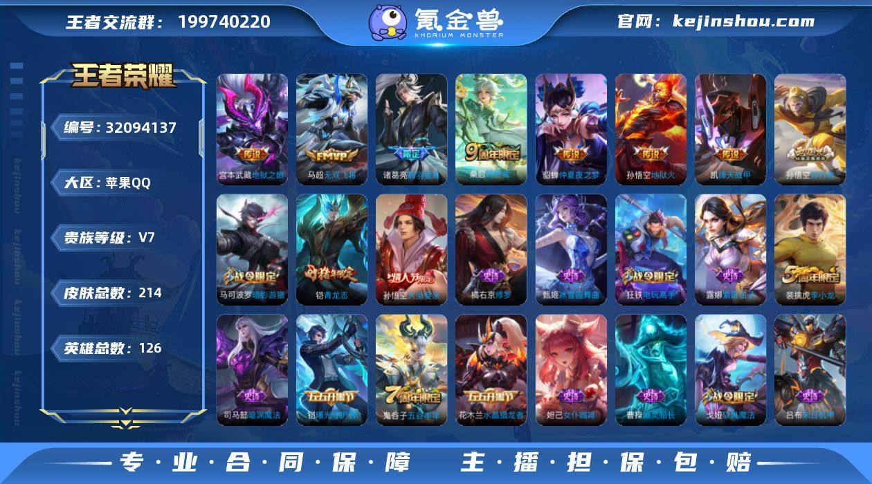 V7 7传说 214皮肤 126英雄 【7传说】马超-无双飞将,貂蝉-仲夏夜之梦,宫本武藏-地狱之眼,铠-绛天战甲,孙悟空-地狱火,诸葛亮-鹤羽星尊,桑启-鸣野蒿【51史诗】鬼谷子-五谷丰年,狂铁-电玩高手,明世隐-吟游魔法,阿轲-节奏热浪,白起-星夜王子,百里守约-特工魅影,百里玄策-原初追逐者,曹操-幽灵船长,程咬金-功夫厨神,妲己-女仆咖啡,妲己-魅力维加斯,狄仁杰-魔术师,狄仁杰-鹰眼统帅,貂蝉-圣诞恋歌,干将莫邪-真爱魔法,宫本武藏-鬼剑武藏,花木兰-水晶猎龙者,橘右京-修罗,铠-曙光守护者,铠-青龙志,兰陵王-暗隐猎兽者,李白-千年之狐,李元芳-逐浪之夏,廉颇-地狱岩魂,刘邦-德古拉伯爵,刘禅-天才门将,露娜-紫霞仙子,吕布-圣诞狂欢,吕布-末日机甲,马可波罗-暗影游猎,蒙犽-狂想玩偶喵,米莱狄-胡桃异想国,墨子-金属风暴,上官婉儿-梁祝,裴擒虎-李小龙,司马懿-暗渊魔法,孙策-猫狗日记,孙尚香-水果甜心,孙尚香-蔷薇恋人,孙悟空-大圣娶亲,孙悟空-孙行者,夏侯惇-乘风破浪,雅典娜-冰冠公主,亚瑟-心灵战警,云中君-纤云弄巧,赵云-皇家上将,甄姬-冰雪圆舞曲,诸葛亮-黄金分割率,庄周-高山流水,梦奇-顽趣,戈娅-驭风魔法