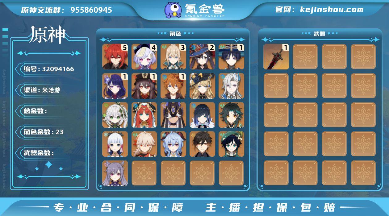 【金色角色】:娜维娅(0命),那维莱特(0命),流浪者(1命),纳西妲(0命),妮露(0命),赛诺(0命),夜兰(0命),雷电将军(1命),神里绫华(0命),枫原万叶(0命),胡桃(1命),魈(0命),甘雨(0命),钟离(0命),达达利亚(1命),温迪(0命),琴(3命),刻晴(0命),迪卢克(5命),莫娜(2命),七七(4命) 【拥有武器】:狼的末路(精1) 【紫色角色】:爱诺(0命),蓝砚(0命),欧洛伦(0命),卡齐娜(1命),嘉明(0命),夏沃蕾(2命),琳妮特(0命),绮良良(2命),卡维(0命),米卡(1命),瑶瑶(0命),珐露珊(3命),莱依拉(1命),坎蒂丝(1命),多莉(1命),柯莱(2命),鹿野院平藏(5命),久岐忍(2命),云堇(3命),五郎(满命),托马(满命),九条裟罗(2命),早柚(满命),烟绯(满命),罗莎莉亚(满命),辛焱(满命),迪奥娜(满命),砂糖(满命),雷泽(5命),菲谢尔(满命),丽莎(3命),北斗(满命),香菱(满命),安柏(4命),班尼特(满命),行秋(满命),芭芭拉(满命),凝光(满命),诺艾尔(满命),凯亚(1命),重云(4命)