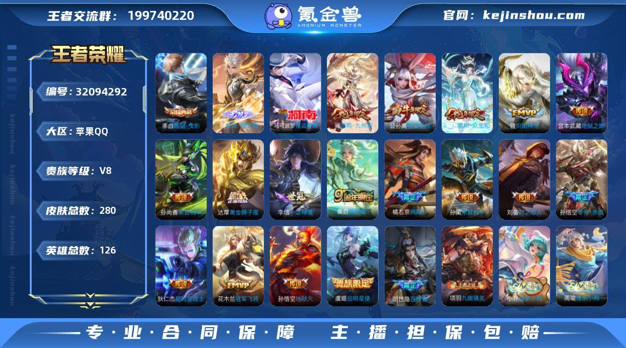 苹果QQ/V8/永恒钻石/270皮肤/126英雄/1典藏/0珍品无双/1无双/1珍品传说/16传说/74史诗/7稀有英雄 【1 珍品传说】怪盗基德 马可波罗, 【1 典藏皮肤】鸣剑·曳影 李白, 【1 无双皮肤】器灵·螭龙剑 曜, 【16 传说皮肤】枫霜尽 橘右京,启明星使 虞姬,零号·赤焰 孙悟空,地狱火 孙悟空,地狱之眼 宫本武藏,祈雪灵祝 公孙离,炽阳神光 镜,时之恋人 刘备,黄金狮子座 达摩,末日机甲 孙尚香,末日机甲 孙策,一念神魔 李信,超时空战士 狄仁杰,愿照·九州拓 澜,愿照·众生和 妲己,鸣野蒿 桑启, 【74 史诗皮肤】时之奇旅 安琪拉,末日机甲 吕布,紫霞仙子 露娜,高山流水 庄周,暗渊魔法 司马懿,暗影游猎 马可波罗,天秀·启明 杨戬,德古拉伯爵 刘邦,山海·玄木吟 马可波罗,心灵战警 亚瑟,无心 元歌,巫礼祀神 少司缘,鬼剑武藏 宫本武藏,百相守梦 黄忠,星夜王子 白起,摇滚巨星 嬴政,电玩高手 狂铁,拒霜思 嫦娥,魅力维加斯 妲己,黄金分割率 诸葛亮,女仆咖啡 妲己,赏金猎手 澜,九幽镇关 项羽,星界游侠 暃,舞动绿茵 蔡文姬,鹰眼统帅 狄仁杰,孙行者 孙悟空,李小龙 裴擒虎,光弋星穹 莱西奥,纤云弄巧 云中君,金属风暴 墨子,傲雪梅枪 韩信,特工魅影 百里守约,猫狗日记 孙策,原初追逐者 百里玄策,逐浪之夏 李元芳,引擎之心 赵云,灵蛊蚀心 扁鹊,鸭鸭历险记 刘禅,魔术师 狄仁杰,龙之律动 狂铁,皇家上将 赵云,冰冠公主 雅典娜,至尊宝 孙悟空,功夫厨神 程咬金,电玩·爆裂旋风 刘禅,天才门将 刘禅,圣诞恋歌 貂蝉,水晶猎龙者 花木兰,圣诞狂欢 吕布,器灵·浮梦炉 赵怀真,茶境仙 孙膑,蔷薇恋人 孙尚香,冰雪圆舞曲 甄姬,月团寄思 沈梦溪,航海奇遇记 老夫子,千年之狐 李白,节奏热浪 阿轲,曙光守护者 铠,万灵启世 女娲,箭羽风息 伽罗,百相守梦 周瑜,万物之道 弈星,绅士熊喵 刘禅,缤纷独角兽 小乔,时之恋人 孙尚香,水果甜心 孙尚香,瑰影绮梦 芈月,化蝶舞 阿轲,江河有...