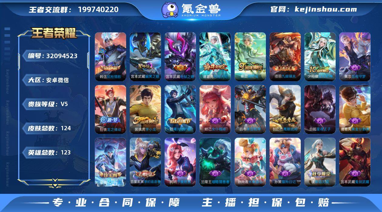 V5 1典藏 3传说 1星元 124皮肤 123英雄 【1水晶】韩信-弑枪猎影【3传说】宫本武藏-地狱之眼,诸葛亮-时雨天司,桑启-鸣野蒿【1星元】宫本武藏-幽冥之眼【24史诗】阿轲-节奏热浪,白起-星夜王子,百里玄策-原初追逐者,程咬金-功夫厨神,妲己-女仆咖啡,妲己-魅力维加斯,狄仁杰-鹰眼统帅,貂蝉-圣诞恋歌,宫本武藏-鬼剑武藏,铠-曙光守护者,兰陵王-暗隐猎兽者,吕布-末日机甲,裴擒虎-李小龙,孙策-猫狗日记,孙尚香-水果甜心,王昭君-偶像歌手,赵云-皇家上将,诸葛亮-黄金分割率,镜-青焰无极,弈星-万物之道,狂铁-龙之律动,黄忠-百相守梦,项羽-九幽镇关,少司缘-巫礼祀神