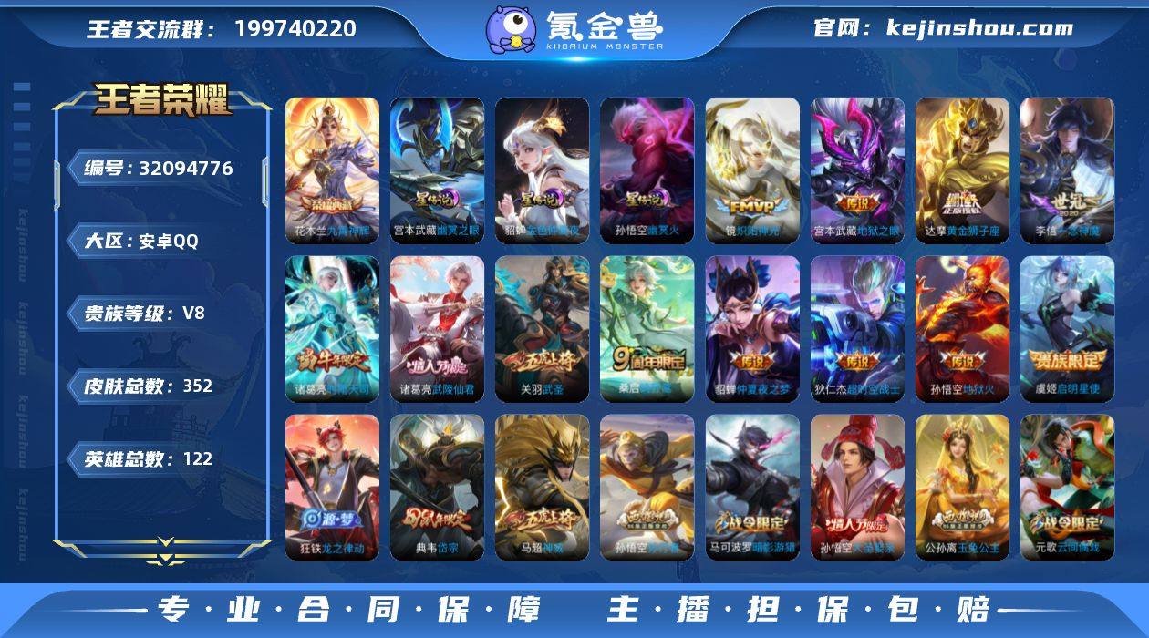 V8 1典藏 12传说 3星元 352皮肤 122英雄 【1水晶】花木兰-九霄神辉【12传说】达摩-黄金狮子座,狄仁杰-超时空战士,貂蝉-仲夏夜之梦,宫本武藏-地狱之眼,关羽-武圣,镜-炽阳神光,李信-一念神魔,孙悟空-地狱火,虞姬-启明星使,诸葛亮-武陵仙君,诸葛亮-时雨天司,桑启-鸣野蒿【3星元】孙悟空-幽冥火,宫本武藏-幽冥之眼,貂蝉-金色仲夏夜之梦【86史诗】元歌-无心,鬼谷子-五谷丰年,赵云-未来纪元,钟无艳-超时空战士,狂铁-电玩高手,明世隐-吟游魔法,公孙离-玉兔公主,夏洛特-永昼,阿轲-节奏热浪,阿轲-迷踪丽影,安琪拉-心灵骇客,白起-星夜王子,百里守约-特工魅影,百里玄策-原初追逐者,不知火舞-魅语,蔡文姬-舞动绿茵,曹操-幽灵船长,蔡文姬-繁星吟游,嫦娥-拒霜思,程咬金-功夫厨神,妲己-女仆咖啡,妲己-魅力维加斯,大乔-猫狗日记,狄仁杰-魔术师,狄仁杰-鹰眼统帅,典韦-岱宗,貂蝉-圣诞恋歌,干将莫邪-真爱魔法,宫本武藏-鬼剑武藏,花木兰-水晶猎龙者,黄忠-火炮绅士,铠-曙光守护者,兰陵王-暗隐猎兽者,老夫子-航海奇遇记,李白-千年之狐,李元芳-逐浪之夏,李元芳-银河之约,廉颇-地狱岩魂,刘邦-德古拉伯爵,刘禅-绅士熊喵,刘禅-天才门将,露娜-紫霞仙子,吕布-圣诞狂欢,吕布-末日机甲,吕布-御风骁将,马超-神威,马可波罗-暗影游猎,蒙犽-狂想玩偶喵,米莱狄-胡桃异想国,墨子-金属风暴,芈月-白晶晶,娜可露露-晚萤,裴擒虎-李小龙,沈梦溪-月团寄思,司马懿-暗渊魔法,孙策-猫狗日记,孙尚香-水果甜心,孙尚香-蔷薇恋人,孙悟空-大圣娶亲,孙悟空-孙行者,夏侯惇-乘风破浪,项羽-苍穹之光,小乔-缤纷独角兽,雅典娜-黎明之约,亚瑟-心灵战警,杨玉环-遇见飞天,嬴政-摇滚巨星,元歌-云间偶戏,云中君-纤云弄巧,张飞-乱世虎臣,赵云-皇家上将,甄姬-冰雪圆舞曲,甄姬-游园惊梦,诸葛亮-黄金分割率,庄周-高山流水,扁鹊-奇幻香踪,暃-星界游侠,梦奇-顽趣,戈娅-驭风魔法,刘禅-电...