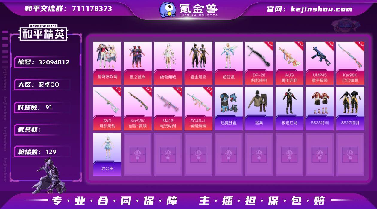 安卓 手Q-2粉装-6特效枪-0载具-1粉色飞行器-57507热力值-11王牌印记-155套装-212枪皮 【热门品类】:套装-龟仙人 【粉色套装】:粉装-闲梦青缨,角色-罪夜之冕 【粉色枪皮等级】:Kar98K-巳巳如意(五级),DP-28-圣堂之誓(七级),DP-28-豹影疾电(五级),MG-36-沧焰双生(五级) 【粉色枪皮】:UMP45-萌骑冒险,Kar98K-巳巳如意,Mk14-福马献瑞,DP-28-圣堂之誓,DP-28-豹影疾电,MG-36-沧焰双生 【粉色飞行器】:炫彩糖果飞行器 【粉色降落伞】:仲夏莫吉托降落伞,精灵梦叶罗丽降落伞,创世·救赎降落伞,无垠阁降落伞,炫彩糖果降落伞 【稀有套装】:套装-龟仙人,套装-巳巳如意,套装-雪国风尚,套装-炫彩糖果,角色-奈斯,套装-马上有钱,套装-火种守卫者,套装-燕燕于飞,套装-鱼渊荷华,角色-绛羽幽主,套装-朱霞炽焰,套装-凌霄紫焰,套装-擎苍青焰,角色-绯色魅影,套装-雨过天青,套装-红釉青花,角色-孙斩天 【稀有枪皮】:AUG-冰晶雪宝,AKM-2P战斗服款,AKM-彩虹符号,AKM-破晓战魂,AKM-萌趣颜团子,AKM-霓虹街区,AKM-龙的传人,M16A4-幻世战舞者,M16A4-红色方程式,M16A4-蓝色火焰,SCAR-L-夜灯,SCAR-L-炫彩节奏,SCAR-L-玉兔迎春,SCAR-L-红色方程式,M416-糯团青竹,M416-红色方程式,M416-蓝色火焰,GROZA-彩虹符号,AUG-天降萌叽,AUG-耀粉歌者,QBZ-彩虹符号,QBZ-洛神天依,M762-天降萌叽,M762-彩虹符号,M762-烈焰拳霸,G36C-星穹咏叹调,AC-VAL-天降萌叽,AC-VAL-快闪甜心,蜜獾-天降萌叽,蜜獾-虎痴许褚,蜜獾-绯穹魔姬,ARX-凌霄紫焰,UZI-啾咪啾咪,UZI-天降萌叽,UZI-炫彩节奏,UZI-红色方程式,UMP45-夜灯,UMP45-涂山之恋,UMP45-生命誓言,UMP45-蓝色火焰,UMP45-极意拳锋,Vector-焰鹰斗篷,Vector-彩虹符号,汤姆逊-天降萌叽,汤姆逊-炫彩节奏,汤姆逊-耀粉歌者,JS9-凌霄紫焰,P9...
