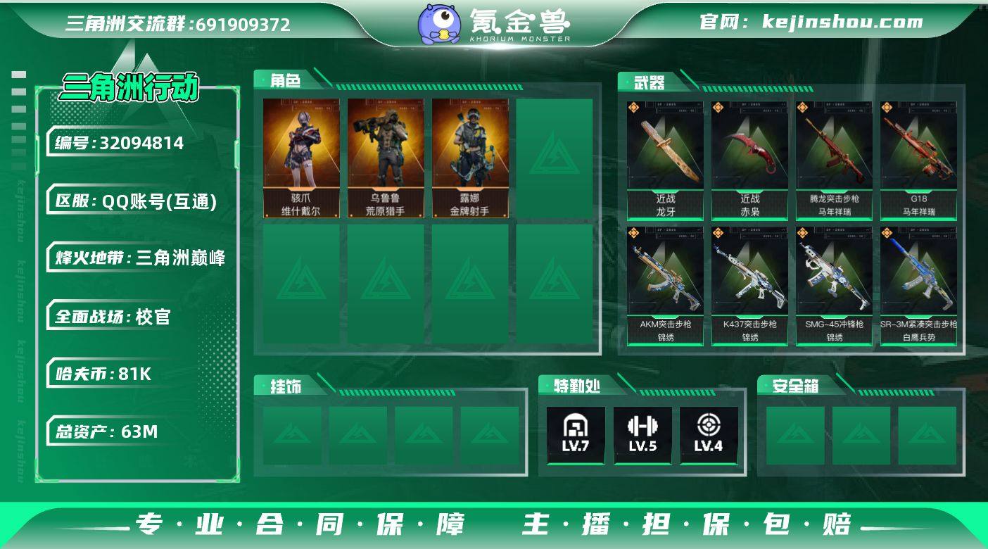 【4476】63m总资产-81k哈伏币-60烽火等级-三角洲巅峰-50战场等级-校官 【干员外观】:骇爪-维什戴尔,露娜-金牌射手,乌鲁鲁-荒原猎手 【近战皮肤】:近战-赤枭,近战-龙牙,近战-处刑者2级,近战-黑鹰 【传说外观】:M4A1突击步枪-阿米娅,AKM突击步枪-锦绣,ASh-12战斗步枪-鹅鸭杀,SG552突击步枪-运动员,SCAR-H战斗步枪-启航,G3战斗步枪-骑士,CAR-15突击步枪-阿米娅,腾龙突击步枪-马年祥瑞,K437突击步枪-锦绣,KC17突击步枪-电锯惊魂,SMG-45冲锋枪-锦绣,SR-3M紧凑突击步枪-白鹰兵势,勇士冲锋枪-能天使-午夜邮差,QCQ171冲锋枪-鹅鸭杀,S12K霰弹枪-电锯惊魂,QJB201轻机枪-鹅鸭杀,M14射手步枪-蛮荒,SKS射手步枪-骑士,R93狙击步枪-维什戴尔,G18-马年祥瑞 【史诗外观】:勇士冲锋枪-檀劫铳影,SVD狙击步枪-檀劫铳影,QBZ95-1突击步枪-竞技风,K416突击步枪-冬日风情,K416突击步枪-腊梅,M7战斗步枪-百步穿杨,SG552突击步枪-哈夫克警备,SCAR-H战斗步枪-囚徒,G3战斗步枪-流沙送葬,G3战斗步枪-哈夫克警备,AS Val突击步枪-百步穿杨,腾龙突击步枪-聚光灯,K437突击步枪-丛影谍踪,MP5冲锋枪-战术竞备,MP5冲锋枪-竞技风,Vector冲锋枪-百步穿杨,SMG-45冲锋枪-阿萨拉特攻,SR-3M紧凑突击步枪-开工大吉,勇士冲锋枪-工业狂潮,勇士冲锋枪-丛影谍踪,MP7冲锋枪-六套之力,725双管霰弹枪-炽焰,PKM通用机枪-阿萨拉特攻,M249轻机枪-丛影谍踪,QJB201轻机枪-炽焰,VSS射手步枪-丛影谍踪,SVD狙击步枪-阿萨拉工艺,M14射手步枪-工业狂潮,SV-98狙击步枪-囚徒,M700狙击步枪-竞技风,M700狙击步枪-百步穿杨,M700狙击步枪-哈夫克警备,AWM狙击步枪-流沙送葬 【稀有外观】:QBZ95-1突击步枪-花岗岩,UZI冲锋枪-旧梦,SG552突击步枪-巨兽,M4A1突击步枪-零点,M4A1突击步枪-繁盛,AKM突击步枪-肃杀,QBZ95-1...