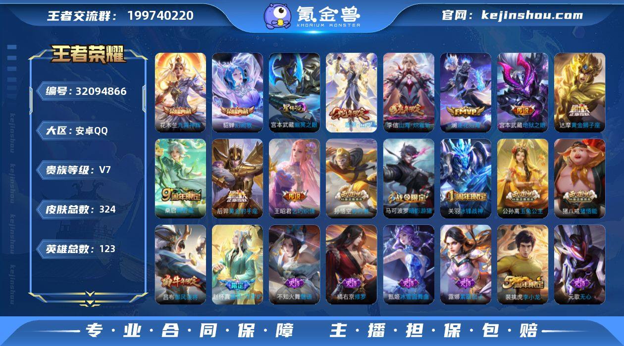 V7 2典藏 8传说 1星元 324皮肤 123英雄 【2水晶】花木兰-九霄神辉,貂蝉-幻阙歌【8传说】李信-山海·炽霜斩,达摩-黄金狮子座,宫本武藏-地狱之眼,后羿-黄金射手座,王昭君-乞巧织情,澜-逐花归海,桑启-鸣野蒿,司空震-愿照·山河定【1星元】宫本武藏-幽冥之眼【79史诗】元歌-无心,鬼谷子-五谷丰年,赵云-未来纪元,钟无艳-超时空战士,明世隐-吟游魔法,公孙离-玉兔公主,夏洛特-永昼,阿轲-暗夜猫娘,阿轲-节奏热浪,安琪拉-心灵骇客,白起-星夜王子,百里守约-特工魅影,百里玄策-原初追逐者,不知火舞-魅语,曹操-幽灵船长,蔡文姬-繁星吟游,嫦娥-拒霜思,程咬金-功夫厨神,妲己-魅力维加斯,狄仁杰-魔术师,狄仁杰-鹰眼统帅,貂蝉-圣诞恋歌,伽罗-箭羽风息,宫本武藏-鬼剑武藏,关羽-冰锋战神,韩信-白龙吟,花木兰-水晶猎龙者,橘右京-修罗,黄忠-火炮绅士,铠-曙光守护者,兰陵王-暗隐猎兽者,李白-千年之狐,李元芳-逐浪之夏,李元芳-银河之约,廉颇-地狱岩魂,刘邦-德古拉伯爵,露娜-紫霞仙子,吕布-圣诞狂欢,吕布-末日机甲,吕布-御风骁将,马可波罗-暗影游猎,墨子-金属风暴,上官婉儿-梁祝,裴擒虎-李小龙,沈梦溪-月团寄思,孙策-猫狗日记,孙尚香-水果甜心,孙悟空-孙行者,王昭君-偶像歌手,夏侯惇-乘风破浪,小乔-缤纷独角兽,雅典娜-冰冠公主,雅典娜-黎明之约,亚瑟-心灵战警,杨玉环-遇见飞天,杨戬-天秀·启明,嬴政-暗夜贵公子,嬴政-优雅恋人,云中君-纤云弄巧,张飞-乱世虎臣,赵云-皇家上将,甄姬-冰雪圆舞曲,甄姬-游园惊梦,钟无艳-王者之锤,诸葛亮-黄金分割率,猪八戒-猪悟能,庄周-高山流水,扁鹊-奇幻香踪,暃-星界游侠,梦奇-顽趣,戈娅-驭风魔法,刘禅-电玩·爆裂旋风,鲁班七号-蔬乡物语,镜-青焰无极,蒙犽-百解令,蒙恬-荣光圣徽,百里守约-百相守梦,弈星-万物之道,赵怀真-器灵·浮梦炉