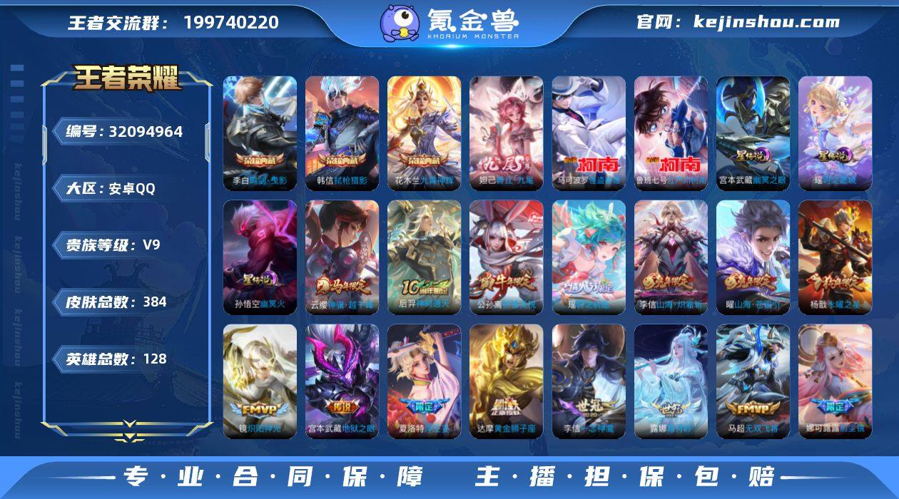 安卓Q-V9-最强王者段位-128英雄-384皮肤-3典藏皮肤-1无双-2珍品传说-35传说-118史诗 【英雄全皮】:孙权全皮,娜可露露全皮,橘右京全皮,猪八戒全皮,敖隐全皮,夏洛特全皮,戈娅全皮,影全皮 【荣耀典藏】:李白鸣剑曳影,花木兰九霄神辉,韩信弑枪猎影 【无双皮肤】:妲己青丘九尾 【珍品传说】:鲁班七号江户川柯南,马可波罗怪盗基德 【传说皮肤】:云缨神骥越千峰,后羿神树通天,桑启鸣野蒿,露娜霜月吟,澜电玩雷克斯,公孙离记忆之芯,夏洛特浮生妄,花木兰燃星之曲,孙悟空齐天大圣,小乔山海琳琅生,曜山海苍雷引,李信山海炽霜斩,吕布怒海麟威,李白诗剑行,王昭君星穹之声,百里守约碎云,橘右京枫霜尽,娜可露露前尘镜,孙尚香音你闪耀,马超无双飞将,瑶时之祈愿,孙尚香异界灵契,公孙离祈雪灵祝,镜炽阳神光,虞姬启明星使,曜云鹰飞将,李信一念神魔,刘备时之恋人,虞姬云霓雀翎,达摩黄金狮子座,花木兰冠军飞将,后羿黄金射手座,杨戬永曜之星,宫本武藏地狱之眼,孙悟空地狱火 【限定皮肤】:狄仁杰阴阳师,小乔山海琳琅生,赵云皇家上将,妲己时之奇旅,嬴政白昼王子,孙尚香异界灵契,鲁班七号狮舞东方,庄周玄嵩,高渐离玩趣恶龙,阿轲迷踪丽影,钟无艳超时空战士,扁鹊奇幻香踪,吕布猎兽之王,周瑜赤莲之焰,元歌云间偶戏,元歌无心,夏侯惇朔风刀,甄姬幽恒,甄姬落雪兰心,马可波罗暗影游猎,马可波罗山海玄木吟,狄仁杰魔术师,狄仁杰万华元夜,达摩沙漠行僧,项羽海滩派对,老夫子醍醐杖,关羽冰锋战神,程咬金演武夺筹,刘邦夺宝奇兵,韩信飞衡,王昭君午后时光,王昭君星穹之声,兰陵王驯魔猎人,兰陵王金庭之子,花木兰默契交锋,花木兰燃星之曲,娜可露露前尘镜,橘右京枫霜尽,亚瑟潮玩骑士王,孙悟空至尊宝,孙悟空孙行者,孙悟空齐天大圣,牛魔御旌,刘备百相守梦,李元芳...