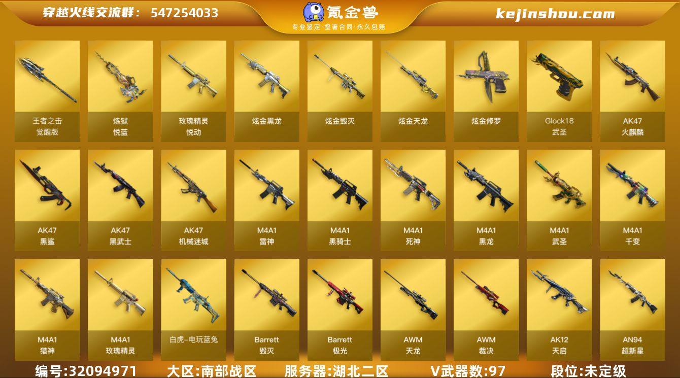 湖北二区-108V-6王者武器数-5炫金武器数 【热门武器】:QBZ03-金色蔷薇,M200-竞技荣光,死亡之眼*6,白虎-电玩蓝兔,M4A1-黑骑士,汤姆逊-烈龙*7,RPK-盘龙,加特林-炼狱,USP-雷暴,沙鹰-修罗*5 【王者炫金武器】:玫瑰精灵-悦动,炼狱-悦蓝,炫金黑龙,炫金毁灭*2,炫金天龙,炫金修罗 【音效卡】:M4A1-苍鸣雷神音效卡,炼狱-百战金芒-庆典舞曲音效卡 【皮肤】:Scar Light-白虎-暗星,裁决-过载 皮肤,雷神-暗月,雷神-星空,M4A1-再燃火线,火麒麟-心动糖果,毁灭-魔灵皮肤,毁灭-神秘黑洞皮肤,黑龙-能量核心,黑龙-暗月,黑骑士耀金皮肤,天龙-能量核心,极光-能量核心,修罗-能量核心,天神-暗月,屠龙-春桃 皮肤,轻型军用手斧-再燃火线 【角色】:零,葵,樱,瞳,电竞教官-云悠悠,审判者,零·纪元,狐影,葵-阿尔法武装,幻面灵狐,初恋灵狐,娟娟,灵狐者-黄金海岸,潘多拉-X,潘多拉-甜心教官,斯沃特-X,新娜塔莎,雪莉杨,影武者-X 【人偶武器】:迷你深渊冰龙,夺魂,迷你生化手雷*2,生化手雷-机甲核心 【暴走生化】:黑龙吞噬者,死亡之眼*6 【挑战大师】:冰龙粉碎者-白马银枪,激光毁灭者III*2,阐释者III 【英雄级武器】:M4A1-千变*2,AK47-火麒麟*2,M4A1-黑龙*2,M4A1-雷神*4,M4A1-黑骑士,M4A1-死神*2,AK47-黑武士,AK12-天启,AN94-超新星,M4A1-武圣*3,AK47-机械迷城,AK47-黑鲨*2,M4A1-玫瑰精灵,QBZ03-金色蔷薇,M4A1-猎神,烈火-动感闪耀,王者之魄-觉醒版,超新星-悦享-觉醒版,AK-47-猩红传说,白虎-电玩蓝兔,HK417-朱雀-电竞之星,AWM-天龙*2,Barrett-毁灭*3,Barrett-极光*3,AWM-裁决,M200-竞技荣光,Barrett-金色蔷薇,王者之怒-觉醒版,RPK-盘龙,加特林-炼狱,炼狱-百战金芒,汤姆逊-烈龙*7,沙鹰-修罗*5,沙鹰-天神*2,USP-雷暴,柯尔特-竞技荣光*