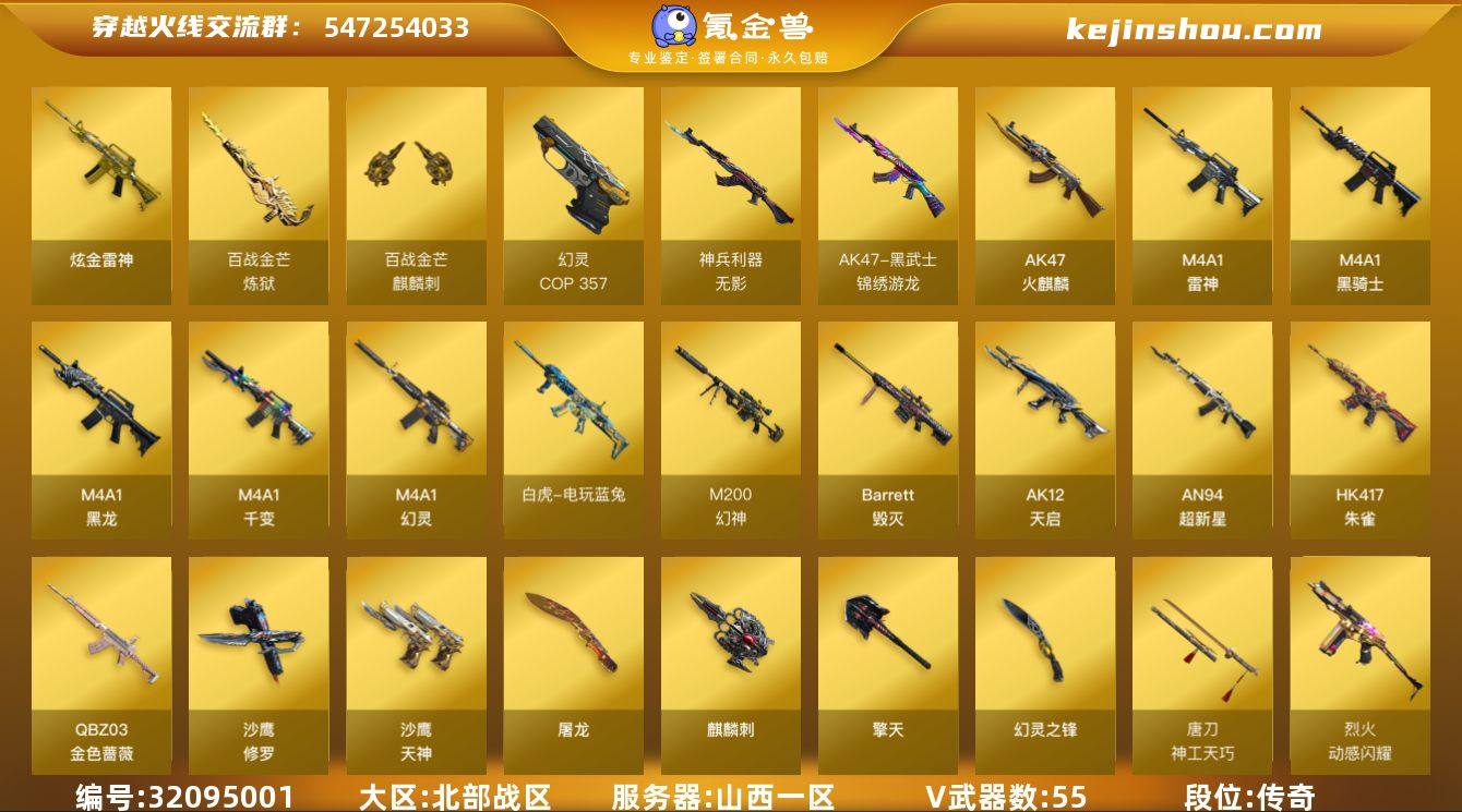 山西一区-60V-0王者武器数-1炫金武器数 【热门武器】:QBZ03-金色蔷薇,HK417-朱雀,M200-幻神,死亡之眼,白虎-电玩蓝兔,M4A1-黑骑士,COP-白鲨,COP 357-幻灵,沙鹰-修罗*4,金刚伞 【王者炫金武器】:炫金雷神 【音效卡】:M200-幻神音效卡,M4A1-黑骑士音效卡,Barrett-碧霄极光音效卡,白虎-盛典舞曲音效卡,炼狱-百战金芒-庆典舞曲音效卡 【皮肤】:M200-幻神-荣耀世冠白鲨,幻神-动感闪耀 皮肤,QBZ03-荣耀世冠白鲨,金色蔷薇-电竞之星 皮肤,AWM-裁决-凤灵皮肤,雷神-暗月,雷神-虎将*2,M4A1-战神赵云,雷神-维纳斯皮肤,M4A1-再燃火线,雷神-神秘按键 皮肤,火麒麟-华夏之心,火麒麟-平天大圣,火麒麟-百城,火麒麟-心动糖果,毁灭-暗月,毁灭-直播专属,毁灭-航天科技皮肤,毁灭-英雄计划 皮肤,M4A1-千变-孔明皮肤*2,黑骑士-CFS2021,黑骑士-破浪10年皮肤,屠龙-春桃 皮肤,屠龙-巅峰荣耀 皮肤,轻型军用手斧-再燃火线,擎天-冠军之击,麒麟刺-萌杀皮肤,麒麟刺-荣耀世冠白鲨 【角色】:关小雨,妮妮,零·纪元,蛇隐宗,乔伊教练,葵-阿尔法武装,幻面灵狐,炽天使,北极狐-X,初恋灵狐,电竞少女,飞虎队-X,嘉年华灵狐,娟娟,0号玩家,灵狐-花神,灵狐者-X,灵狐者-黄金海岸,灵狐者-七夕宝贝,龙儿,麻雀,曼陀罗-礼服,萌儿,潘多拉-X,潘多拉-甜心教官,蛇姬,斯沃特-X,蜀雪,樱-青春偶像,樱-战斗天使 【人偶武器】:COP-白鲨,迷你宝贝*2,AWM-灵狐-15周年嘉年华*2,迷你深渊冰龙,迷你裂空之翼,迷你波特博士*6,迷你火种*2,迷你生化手雷*2,生化手雷-机甲核心*3,深渊终结者手雷*2 【暴走生化】:死亡之眼,超级对讲机 【挑战大师】:冰龙粉碎者-白马银枪,激光毁灭者III-白马银枪,VEPR-12-金魔,机甲撕裂者III,试炼破坏者III,神圣爆裂者-末日III 【英雄级武器】:M4A1-千变,AK47-...