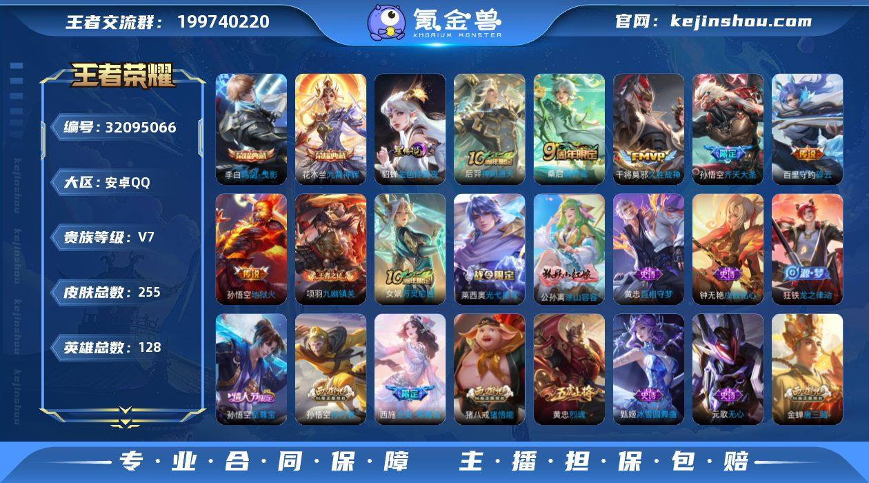 V7 3典藏 6传说 1星元 255皮肤 128英雄 【3水晶】花木兰-九霄神辉,李白-鸣剑·曳影【6传说】孙悟空-齐天大圣,百里守约-碎云,干将莫邪-久胜战神,孙悟空-地狱火,桑启-鸣野蒿,后羿-神树通天【1星元】貂蝉-金色仲夏夜之梦【52史诗】元歌-无心,鬼谷子-五谷丰年,赵云-未来纪元,钟无艳-超时空战士,金蝉-唐三藏,貂蝉-唤灵魅影,阿轲-节奏热浪,安琪拉-心灵骇客,白起-星夜王子,曹操-幽灵船长,程咬金-功夫厨神,妲己-魅力维加斯,大乔-猫狗日记,狄仁杰-魔术师,狄仁杰-鹰眼统帅,伽罗-箭羽风息,宫本武藏-鬼剑武藏,花木兰-水晶猎龙者,黄忠-烈魂,李白-千年之狐,吕布-圣诞狂欢,吕布-末日机甲,米莱狄-胡桃异想国,墨子-金属风暴,孙膑-天狼运算者,孙尚香-水果甜心,孙尚香-蔷薇恋人,孙悟空-至尊宝,孙悟空-孙行者,王昭君-偶像歌手,西施-诗语江南,项羽-苍穹之光,雅典娜-冰冠公主,雅典娜-黎明之约,亚瑟-心灵战警,嬴政-摇滚巨星,张飞-虎魄,赵云-皇家上将,甄姬-冰雪圆舞曲,猪八戒-猪悟能,扁鹊-奇幻香踪,暃-星界游侠,戈娅-驭风魔法,盾山-梦圆繁星,西施-至美·乘鲤谣,狂铁-龙之律动,钟无艳-戍鼓铭心,黄忠-百相守梦,公孙离-涂山容容,项羽-九幽镇关,女娲-万灵启世,莱西奥-光弋星穹