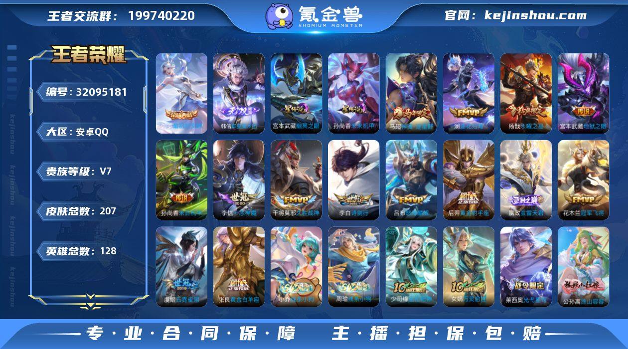 可换绑【精品优质号·伽罗典藏·韩信无双·马年马超·狗年杨戬·青春决赛季·多传说限定号】9按键,2星传说,13王者印记,五级铭文100,可二次CD17942,安卓Q-V7-207皮肤-1典藏皮肤-1无双-14传说-56史诗【英雄全皮】:孙权全皮,敖隐全皮,蒙恬全皮,影全皮【荣耀典藏】:伽罗最初的交响【无双皮肤】:韩信群星魔术团【星元皮肤】:宫本武藏幽冥之眼,孙尚香未来机甲【传说皮肤】:马超神骥逐星野,嬴政玄雷天君,澜逐花归海,吕布怒海麟威,李白诗剑行,李信一念神魔,张良黄金白羊座,干将莫邪久胜战神,虞姬云霓雀翎,花木兰冠军飞将,后羿黄金射手座,杨戬永曜之星,孙尚香末日机甲,宫本武藏地狱之眼【限定皮肤】:狄仁杰阴阳师,赵云皇家上将,墨子神迹守卫,庄周高山流水,高渐离玩趣恶龙,元歌云间偶戏,元歌无心,夏侯惇朔风刀,狄仁杰魔术师,狄仁杰万华元夜,达摩沙漠行僧,项羽海滩派对,老夫子醍醐杖,老夫子航海奇遇记,程咬金演武夺筹,兰陵王金庭之子,花木兰青春决赛季,亚瑟潮玩骑士王,孙悟空至尊宝,后羿辉光之辰,李元芳云中旅人,钟馗驱傩正仪,杨戬永曜之星,干将莫邪冰霜恋舞曲,雅典娜黎明之约,鬼谷子原初探秘者,鬼谷子五谷丰年,苏烈千军破阵,百里玄策原初追逐者,弈星混沌棋,梦奇顽趣,沈梦溪大漠名商,明世隐疑决卦,裴擒虎李小龙,裴擒虎擒涛扼浪,盾山御銮,嫦娥拒霜思,鲁班大师探海日志,桑启海盐诗旅,艾琳流音漫舞,阿古朵江河有灵,张良古海寻踪,蒙犽百解令,蒙恬荣光圣徽,鬼谷子天穹祈灯,姬小满妄想食味,沈梦溪龙舞盛年,韩信群星魔术团,海诺心动手记【年限皮肤】:杨戬永曜之星,后羿辉光之辰【赛季限定】:盾山御銮,夏侯惇朔风刀,弈星混沌棋,明世隐疑决卦,老夫子醍醐杖,鬼谷子原初探秘者,狄仁杰万华元夜,程咬金演武夺筹,钟馗驱傩正仪,苏烈千军破阵,达摩沙漠行...