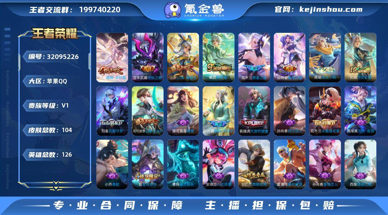 【4863】苹果Q-V0-最强王者段位-126英雄-104皮肤-6传说-34史诗 【传说皮肤】:虞姬愿照岁时盈,桑启鸣野蒿,花木兰燃星之曲,小乔山海琳琅生,孙尚香音你闪耀,宫本武藏地狱之眼 【限定皮肤】:狄仁杰阴阳师,小乔山海琳琅生,赵云皇家上将,孙尚香蔷薇恋人,扁鹊奇幻香踪,芈月幻夜卜梦,马可波罗山海玄木吟,狄仁杰魔术师,达摩沙漠行僧,项羽海滩派对,老夫子醍醐杖,花木兰燃星之曲,刘备百相守梦,李元芳云中旅人,杨戬潮玩骑兵,百里玄策原初追逐者,裴擒虎天狼狩猎者,裴擒虎擒涛扼浪,嫦娥暖冬兔眠,鲁班大师探海日志,桑启海盐诗旅,暃星界游侠,阿古朵江河有灵,张良古海寻踪,鬼谷子天穹祈灯,沈梦溪龙舞盛年,刘邦剑破天穹 【年限皮肤】:小乔山海琳琅生,马可波罗山海玄木吟,虞姬愿照岁时盈 【赛季限定】:老夫子醍醐杖,达摩沙漠行僧,李元芳云中旅人,桑启海盐诗旅,裴擒虎擒涛扼浪,鲁班大师探海日志,张良古海寻踪,鬼谷子天穹祈灯,刘邦剑破天穹,东皇太一噬灭天穹,太乙真人谧流熔炉,钟馗虚灵犬护,亚瑟荣光之誓,百里玄策原初追逐者 【战令限定】:芈月幻夜卜梦,暃星界游侠,嫦娥暖冬兔眠,扁鹊奇幻香踪,杨戬潮玩骑兵,周瑜线条小狗 【史诗皮肤】:周瑜线条小狗,女娲万灵启世,赵怀真器灵浮梦炉,阿古朵江河有灵,刘备百相守梦,扁鹊奇幻香踪,马可波罗山海玄木吟,暃星界游侠,高渐离天秀音浪,貂蝉唤灵魅影,西施诗语江南,百里玄策原初追逐者,孙尚香时之恋人,小乔青蛇,娜可露露晚萤,狄仁杰鹰眼统帅,裴擒虎天狼狩猎者,孙策猫狗日记,李元芳逐浪之夏,蔡文姬舞动绿茵,百里守约特工魅影,安琪拉心灵骇客,兰陵王暗隐猎兽者,小乔缤纷独角兽,夏侯惇乘风破浪,刘邦德古拉伯爵,花木兰水晶猎龙者,曹操幽灵船长,吕布圣诞狂欢,墨子金属风暴,孙尚香水果甜心,孙尚香蔷薇恋人,狄仁...
