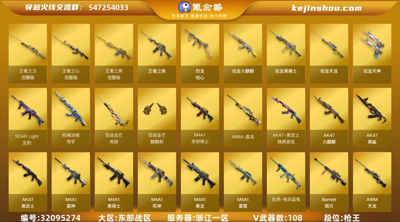 浙江一区-122V-5王者武器数-5炫金武器数 【热门武器】:QBZ03-金色蔷薇,M200-竞技荣光,死亡之眼,白虎-电玩蓝兔,QBZ03-街机,M4A1-黑骑士*6,汤姆逊-烈龙*6,RPK-盘龙*6,加特林-炼狱*3,裁决-雪莉杨,USP-雷暴*2,沙鹰-修罗*5 【王者炫金武器】:王者之势,烈龙-悦心,炫金火麒麟,炫金骑士,炫金天龙,炫金天神*2 【音效卡】:M4A1-雷神音效卡,M4A1-黑骑士音效卡,Barrett-毁灭音效卡,AWM-裁决音效卡,Barrett-碧霄极光音效卡,炼狱-百战金芒-庆典舞曲音效卡,AWM-昌龙-怀旧音效卡 【皮肤】:裁决-叶芒苍灵 皮肤,裁决-运输船 皮肤,雷神-暗月,雷神-能量核心,雷神-星空,雷神-耀金皮肤,M4A1-战神赵云,雷神-机甲刑天皮肤,雷神-宇航兔皮肤,M4A1-再燃火线,火麒麟-雷神,毁灭-暗月,毁灭-星空,毁灭-冠军之怒,毁灭-黑大圣皮肤,黑龙-能量核心,黑龙-暗月,无影耀金皮肤,战神-粉色甜心皮肤,战神-紫绶金章皮肤,战神-流金岁月皮肤,AK47-B-常胜将军-曹操,修罗-能量核心*2,修罗-星空,屠龙-惊鸿 皮肤,轻型军用手斧-再燃火线 【角色】:零,樱,炫,雨棠,电竞教官-云悠悠,零·纪元,战地猎狐,王者-零,葵-阿尔法武装,幻面灵狐,暗夜-X,初恋灵狐,芳心审判者,飞虎队-X,风暴女,虎妞,嘉年华灵狐,娟娟,灵狐者-X,麻雀,青霞仙子,甜心偶像,铁骑荣耀,樱-战斗天使,影武者-X 【人偶武器】:裁决-雪莉杨,火麒麟-灵狐,迷你救赎猎手,AWM-灵狐-15周年嘉年华*2,迷你深渊冰龙,迷你牛牛,迷你生化手雷,生化手雷-机甲核心,闪光弹-小乔,闪光弹-貂蝉,高爆手雷-大乔,灵狐娃娃手雷 【暴走生化】:死亡之眼,超级对讲机 【挑战大师】:神圣爆裂者III,AK47-冰龙粉碎者,冰龙粉碎者-白马银枪,激光毁灭者III-白马银枪,激光毁灭者III*2 【英雄级武器】:AK47-火麒麟,M4A1-黑龙*2,M4A1-雷神,M4A1-...