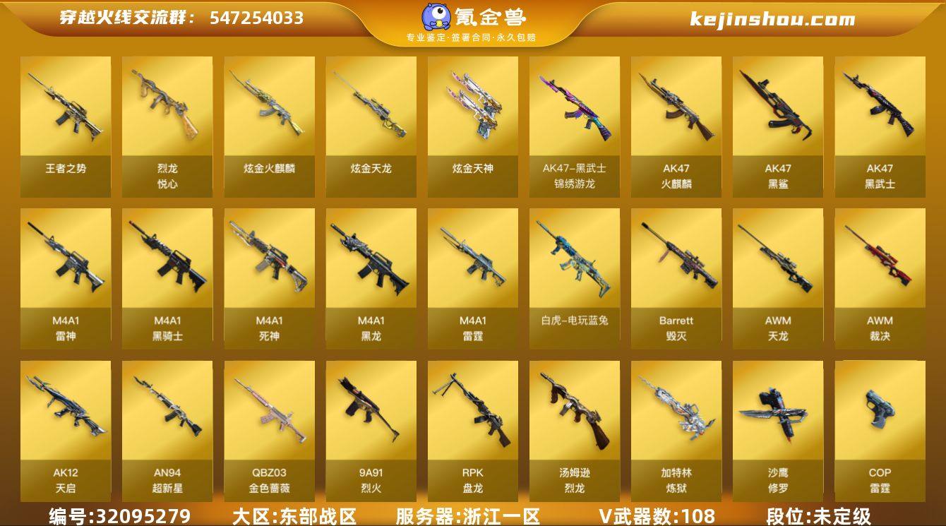 浙江一区-122V-5王者武器数-5炫金武器数 【热门武器】:QBZ03-金色蔷薇,M200-竞技荣光,死亡之眼,白虎-电玩蓝兔,QBZ03-街机,M4A1-黑骑士*6,汤姆逊-烈龙*6,RPK-盘龙*6,加特林-炼狱*3,裁决-雪莉杨,USP-雷暴*2,沙鹰-修罗*5 【王者炫金武器】:王者之势,烈龙-悦心,炫金火麒麟,炫金骑士,炫金天龙,炫金天神*2 【音效卡】:M4A1-雷神音效卡,M4A1-黑骑士音效卡,Barrett-毁灭音效卡,AWM-裁决音效卡,Barrett-碧霄极光音效卡,炼狱-百战金芒-庆典舞曲音效卡,AWM-昌龙-怀旧音效卡 【皮肤】:裁决-叶芒苍灵 皮肤,裁决-运输船 皮肤,雷神-暗月,雷神-能量核心,雷神-星空,雷神-耀金皮肤,M4A1-战神赵云,雷神-机甲刑天皮肤,雷神-宇航兔皮肤,M4A1-再燃火线,火麒麟-雷神,毁灭-暗月,毁灭-星空,毁灭-冠军之怒,毁灭-黑大圣皮肤,黑龙-能量核心,黑龙-暗月,无影耀金皮肤,战神-粉色甜心皮肤,战神-紫绶金章皮肤,战神-流金岁月皮肤,AK47-B-常胜将军-曹操,修罗-能量核心*2,修罗-星空,屠龙-惊鸿 皮肤,轻型军用手斧-再燃火线 【角色】:零,樱,炫,雨棠,电竞教官-云悠悠,零·纪元,战地猎狐,王者-零,葵-阿尔法武装,幻面灵狐,暗夜-X,初恋灵狐,芳心审判者,飞虎队-X,风暴女,虎妞,嘉年华灵狐,娟娟,灵狐者-X,麻雀,青霞仙子,甜心偶像,铁骑荣耀,樱-战斗天使,影武者-X 【人偶武器】:裁决-雪莉杨,火麒麟-灵狐,迷你救赎猎手,AWM-灵狐-15周年嘉年华*2,迷你深渊冰龙,迷你牛牛,迷你生化手雷,生化手雷-机甲核心,闪光弹-小乔,闪光弹-貂蝉,高爆手雷-大乔,灵狐娃娃手雷 【暴走生化】:死亡之眼,超级对讲机 【挑战大师】:神圣爆裂者III,AK47-冰龙粉碎者,冰龙粉碎者-白马银枪,激光毁灭者III-白马银枪,激光毁灭者III*2 【英雄级武器】:AK47-火麒麟,M4A1-黑龙*2,M4A1-雷神,M4A1-...