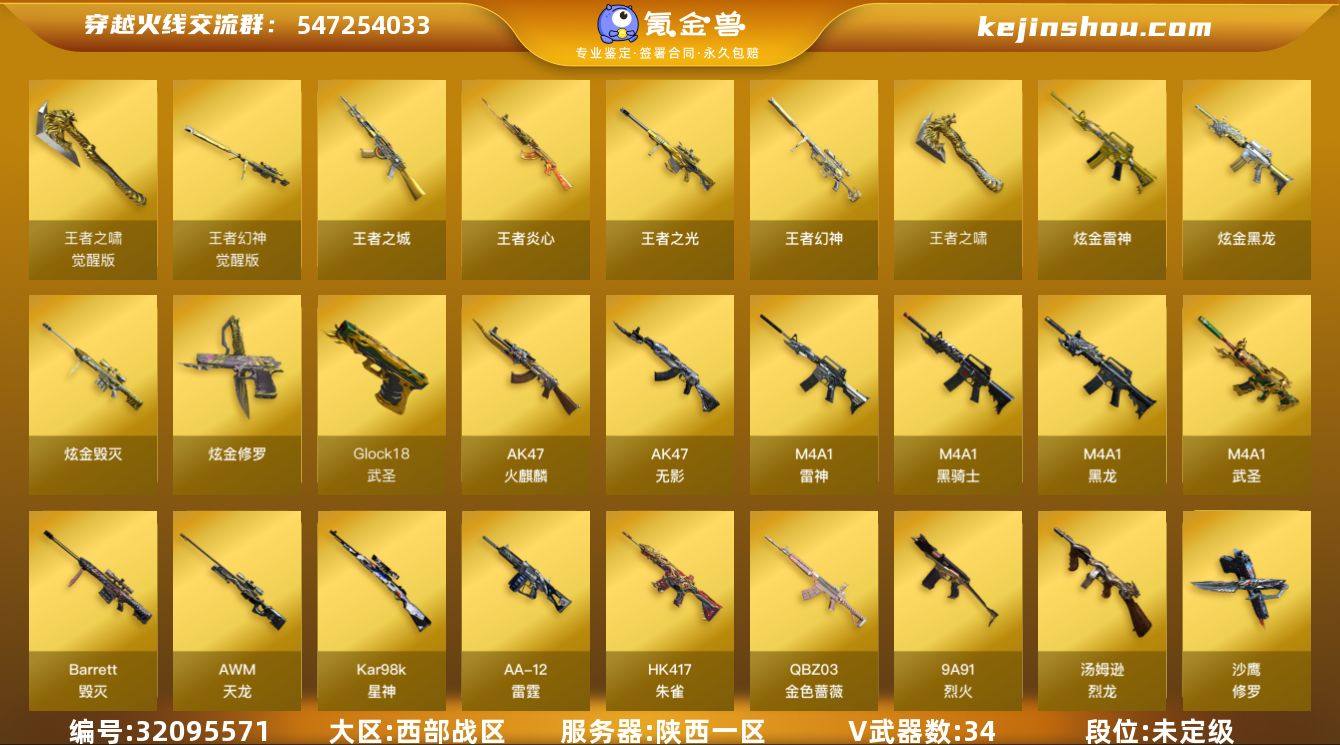 陕西一区-37V-6王者武器数-5炫金武器数 【热门武器】:王者幻神,QBZ03-金色蔷薇,HK417-朱雀,死亡之眼,王者炎心,Kar98K-星神,M4A1-黑骑士,汤姆逊-烈龙,加特林-炼狱,沙鹰-修罗*3 【王者炫金武器】:王者之城,王者炎心,王者幻神,王者之光,王者之啸,炫金骑士,炫金黑龙,炫金雷神,炫金毁灭,炫金修罗 【音效卡】:M4A1-雷神音效卡,M4A1-黑骑士音效卡,炼狱-百战金芒-庆典舞曲音效卡 【皮肤】:烈龙-星空,雷神-星空,雷神-虎将,M4A1-再燃火线,火麒麟-华夏之心,火麒麟-战神关羽,火麒麟-白虎,毁灭-英雄计划 皮肤,黑龙-暗月,M4A1-黑龙-361,M4A1-黑骑士-娜塔莉娅 皮肤,AWM-天龙-传奇白鲨,轻型军用手斧-再燃火线 【角色】:零,樱,乔伊教练,葵-阿尔法武装,暗夜-X,北极狐-X,初恋灵狐,猎狐者-追月,零-水下丽影,灵狐者-X,萌儿,娜塔莉娅,青霞仙子,雪莉杨,雪莉杨-摸金校尉,影武者-X 【人偶武器】:火麒麟-灵狐,M4A1-雷神-精英刀锋,迷你救赎猎手 【暴走生化】:死亡之眼 【挑战大师】:冰龙粉碎者-白马银枪,激光毁灭者III 【英雄级武器】:AK47-火麒麟,M4A1-黑龙,M4A1-雷神,M4A1-黑骑士,AK47-无影,M4A1-武圣,HK417-朱雀,QBZ03-金色蔷薇,9A91-烈火,黑武士-CF网剧冠军,机械迷城-穹宇,AWM-天龙,Barrett-毁灭,Kar98K-星神,王者之怒-觉醒版,加特林-炼狱,炼狱-百战金芒,汤姆逊-烈龙,AA-12-雷霆,沙鹰-修罗*3,Glock18-武圣,天神-CF网剧冠军,屠龙,龙啸,擎天-CF网剧冠军,麒麟刺-百战金芒,高爆手雷-雷霆,闪光弹-雷霆,烟雾弹-雷霆 【道具】:BS战队炫彩背包,云山科技背包,百战金芒炫彩背包,超级背包,女皇终结者-魔龙之吻,救世主-黑桃战神,绿色巨人,生化弹匣,夺命之镰,防化服*2,星辰流光-枪王排位,语音特效-盛典烟火,萌萌小葵表情,防弹头盔*2,防弹衣*2...