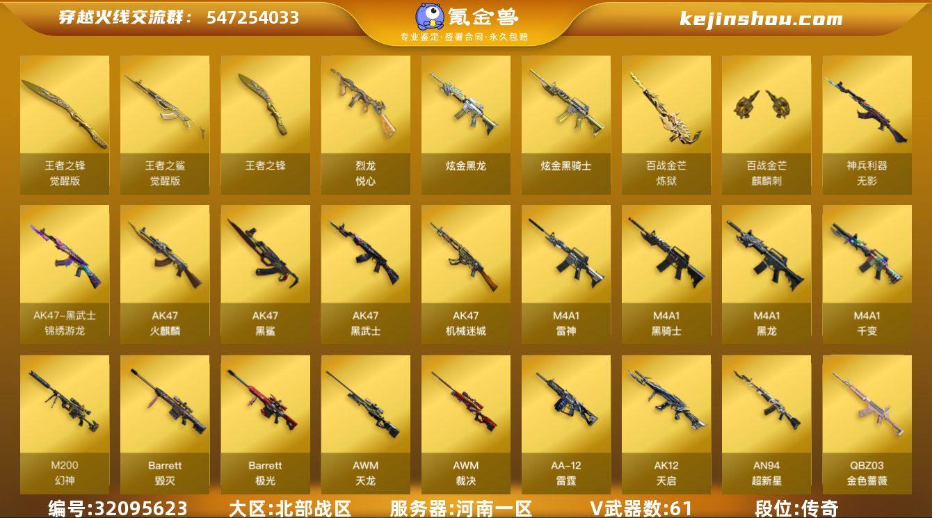 河南一区-64V-6王者-2炫金 【热门武器】:QBZ03-金色蔷薇,M200-幻神,死亡之眼,M4A1-黑骑士,汤姆逊-烈龙*6,RPK-盘龙*6,加特林-炼狱*4,沙鹰-修罗*2 【王者炫金武器】:烈龙-悦心,王者之锋*2,炫金骑士,炫金黑龙 【音效卡】:Barrett-碧霄极光音效卡,炼狱-百战金芒-庆典舞曲音效卡 【皮肤】:雷神-暗月*2,雷神-能量核心*2,雷神-星空,雷神-宇航兔皮肤,M4A1-再燃火线,火麒麟-雷神,火麒麟-心动糖果,毁灭-暗月*2,毁灭-星空,毁灭-百城浙江 皮肤,黑龙-能量核心,黑龙-暗月,黑骑士-暗月*2,无影-暗月*2,天启-暗月*2,天龙-秘银*2,天龙-能量核心,AWM-天龙-传奇白鲨,极光-能量核心*3,修罗-能量核心*2,天神-暗月,轻型军用手斧-再燃火线,麒麟刺-萌杀皮肤 【角色】:葵,樱,王者-零,奇洋探员,空,初恋灵狐,风暴女,虎妞,嘉年华灵狐,猎狐者-追月,零-热舞青春,灵狐者-X,麻雀,潘多拉-X,潜龙队-X,青霞仙子,蛇姬,斯沃特-X,铁骑荣耀,夜玫瑰-宠粉,影武者-X 【人偶武器】:AWM-灵狐-15周年嘉年华,迷你深渊冰龙,迷你生化手雷,生化手雷-机甲核心*2 【暴走生化】:死亡之眼 【挑战大师】:神圣爆裂者III,激光毁灭者III 【英雄级武器】:M4A1-千变,AK47-火麒麟,M4A1-黑龙,M4A1-雷神*2,M4A1-黑骑士,AK47-黑武士,AK12-天启,AN94-超新星,AK47-机械迷城,AK47-黑鲨,无影-神兵利器,黑武士-锦绣游龙,QBZ03-独角-III,QBZ03-金色蔷薇,AK-47-猩红传说*2,王者之鲨-觉醒版,AWM-天龙,Barrett-毁灭,Barrett-极光,AWM-裁决,M200-幻神,Barrett-金色蔷薇,RPK-盘龙*6,加特林-炼狱*4,炼狱-百战金芒,汤姆逊-烈龙*6,AA-12-雷霆,沙鹰-修罗*2,沙鹰-天神*4,屠龙*2,龙啸,擎天,麒麟刺,擎天-竞技荣光,麒麟刺-百战金芒,王者之锋-觉醒版,高爆手雷-竞技荣光*2,手雷-热带奇洋,M4A1-...