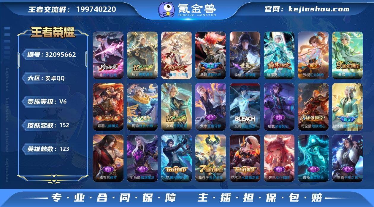 【WZ181102】安卓Q-V6-最强王者段位-123英雄-152皮肤-1珍品传说-8传说-39史诗【英雄全皮】:孙权全皮【珍品传说】:暃朽木白哉【传说皮肤】:貂蝉神骥聚万邦,后羿神树通天,澜愿照九州拓,云缨幻光神枪,桑启鸣野蒿,马超琥珀纪元,诸葛亮时雨天司,李信一念神魔【限定皮肤】:狄仁杰阴阳师,赵云皇家上将,孙尚香蔷薇恋人,狄仁杰魔术师,狄仁杰万华元夜,项羽海滩派对,老夫子醍醐杖,程咬金演武夺筹,兰陵王金庭之子,李元芳云中旅人,钟馗驱傩正仪,鬼谷子原初探秘者,鬼谷子五谷丰年,诸葛亮时雨天司,百里玄策原初追逐者,沈梦溪大漠名商,裴擒虎擒涛扼浪,云中君纤云弄巧,鲁班大师探海日志,桑启海盐诗旅,艾琳流音漫舞,司空震地狱燃心,张良古海寻踪,蒙恬荣光圣徽,高渐离燃音魔法,妲己灵卜魔法,鬼谷子天穹祈灯,马超琥珀纪元,沈梦溪龙舞盛年,刘邦剑破天穹,程咬金群星魔术团【年限皮肤】:诸葛亮时雨天司,澜愿照九州拓【赛季限定】:老夫子醍醐杖,鬼谷子原初探秘者,狄仁杰万华元夜,程咬金演武夺筹,钟馗驱傩正仪,兰陵王金庭之子,沈梦溪大漠名商,李元芳云中旅人,桑启海盐诗旅,裴擒虎擒涛扼浪,鲁班大师探海日志,张良古海寻踪,鬼谷子天穹祈灯,刘邦剑破天穹,东皇太一噬灭天穹,钟馗虚灵犬护,亚瑟荣光之誓,百里玄策原初追逐者,蒙恬荣光圣徽,牛魔星界战将,项羽九幽镇关【战令限定】:司空震地狱燃心,艾琳流音漫舞,高渐离燃音魔法,妲己灵卜魔法,周瑜线条小狗【史诗皮肤】:周瑜线条小狗,项羽九幽镇关,女娲万灵启世,黄忠百相守梦,后羿石田雨龙,扁鹊灵蛊蚀心,赵怀真器灵浮梦炉,弈星万物之道,牛魔星界战将,蒙恬荣光圣徽,高渐离燃音魔法,妲己灵卜魔法,司空震地狱燃心,镜真我赫兹,鬼谷子五谷丰年,司马懿暗渊魔法,云中君纤云弄巧,百里玄策原初追逐者,橘右京修罗,狄...