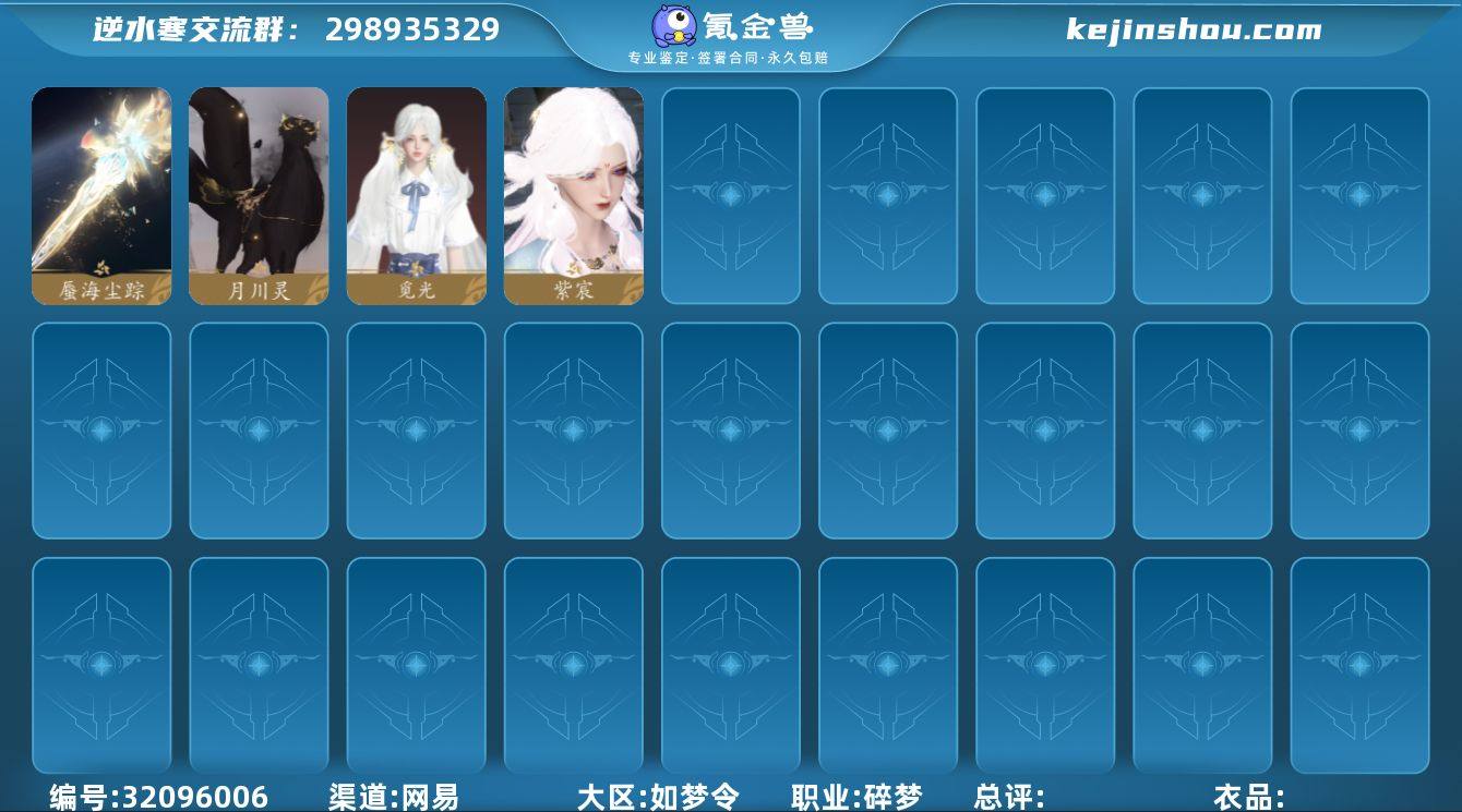 【区服】 刀剑如梦 【战力值】 57.11 【职业】 碎梦 【馆藏】 1级 【衣品值】 97320 【国色值】 6620 【已用天赏石】 6 【充值称号】 放歌清宵 【累计充值】 1510元 【剩余赠礼额度】 1483纹玉 【灵韵内功】 熔甲 【副本外观】 飞焰流波 【天赏外观】 觅光, 紫宸, 海市蜃楼武器 【天赏祥瑞】 月川灵 【祥瑞坐骑】 云螭·探宇寻寰, 龙衔瑞焰, 金冠鼠鼠, 粉黛娇, 幻琉晶, 呆宝, 布丁, 星河转·银昼, 风行·江湖景, 星河转·金夕, 风行·世间情, 风行·万灯明, 伯力, 咩郎, 瓜皮, 墨流云·玄色, 墨流云·靛青, 彩虹小马, 墨流云·朱红, 玉霄飞练, 绒绒夜, 隐云涧, 四方游士, 空山闲 【商城外观】 侠影流霜, 灵语星彩, 天籁闻歌, 跃动心芒, 贪狼摄星, 紫微御宵, 赤狐魅语 【武器环身】 谪仙人, 振金雷, 卧龙奇策, 南枝已谢
