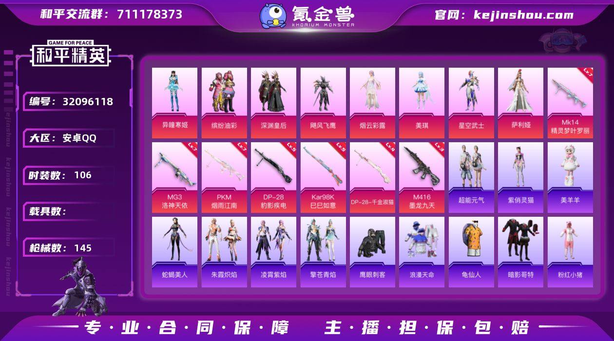 安卓 手Q-8粉装-7特效枪-0载具-5粉色飞行器-50887热力值-5王牌印记-106套装-145枪皮 【热门品类】:粉装-缤纷油彩,套装-浪漫天命,套装-龟仙人,套装-暗影哥特,套装-粉红小猪,角色-8号机,角色-Mark.06 【粉色套装】:粉装-深渊皇后,粉装-缤纷油彩,粉装-飓风飞鹰,角色-烟云彩露,角色-美琪,角色-星空武士,角色-萨利娅,角色-异瞳寒姬 【粉色枪皮等级】:M416-墨龙九天(三级),Kar98K-巳巳如意(五级),Mk14-精灵梦叶罗丽(七级),DP-28-千金淑猫(四级),DP-28-豹影疾电(五级),MG3-洛神天依(七级),PKM-江南烟雨(七级) 【粉色枪皮】:M416-墨龙九天,Kar98K-巳巳如意,Mk14-精灵梦叶罗丽,DP-28-千金淑猫,DP-28-豹影疾电,MG3-洛神天依,PKM-江南烟雨 【粉色飞行器】:繁龙极客飞行器,鎏金朋克飞行器,龙翔九天飞行器,极意拳锋飞行器 【粉色降落伞】:齐天大圣降落伞,暗夜鎏金降落伞,炫光之旅降落伞,萌酷奶龙降落伞,圣堂之誓降落伞,江南烟雨降落伞,星空武士降落伞,精灵梦叶罗丽降落伞,墨龙九天降落伞,守护天翼降落伞,忍者神龟降落伞,宇宙意志降落伞,千金淑猫降落伞,脆鲨七海降落伞,星穹咏叹调降落伞,幻彩电音降落伞,冷漠罗丽降落伞,喜羊羊与灰太狼降落伞 【稀有套装】:套装-龟仙人,套装-巳巳如意,套装-超能元气,套装-雏菊兔兔,套装-萝兰蝴蝶,套装-小熊娃娃,套装-糖糖葫芦,套装-青团波波,套装-棉花软糖,角色-都市丽猫,角色-光矢逐梦,套装-晶辉守护,套装-星渊小夜曲,套装-彩虹兔,套装-云朵鹅,套装-雪绒豹,角色-灵公主,套装-朱霞炽焰,套装-凌霄紫焰,套装-擎苍青焰,角色-蛇蝎美人,玩偶服-美羊羊,角色-紫俏灵猫 【稀有枪皮】:AKM-影袭,AKM-江南烟雨,AKM-破晓战魂,AKM-龙的传人,AKM-玄冥寒域,M16A4-千金淑猫,SCAR-L-炫彩节奏,SCAR-L-玉兔迎春,SCAR-L-红色方...